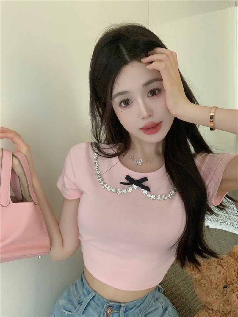 リボンショートTシャツ サマースリムフィット薄手トップス ピンク 夏物 ピュア 10/5 秋冬 オータム ウインター ナチュラル mi4613501747039