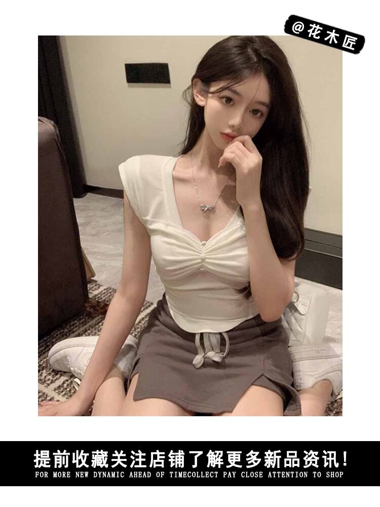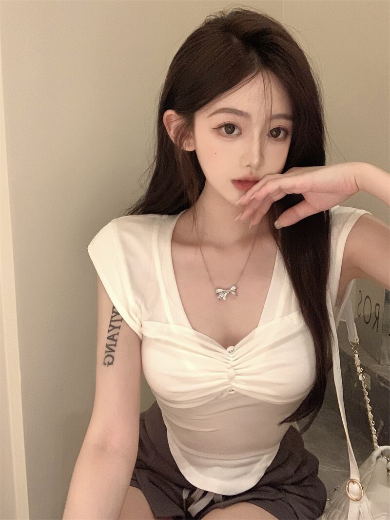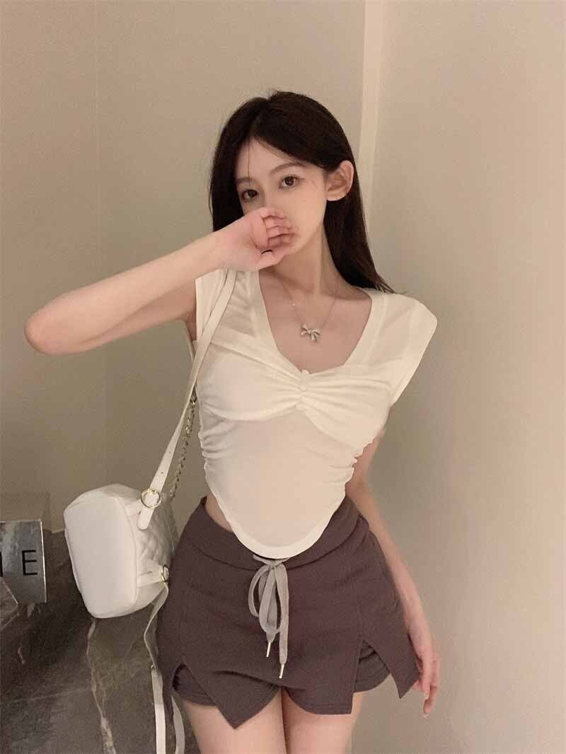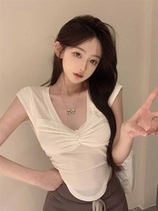 スタイルホワイトVネックショートTシャツ サマープリーツスリムトップス 夏物 10/5 秋冬 オータム ウインター ナチュラル mi4617896148641