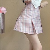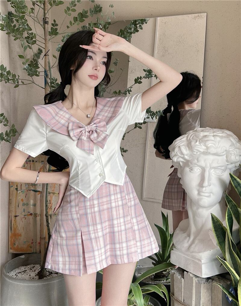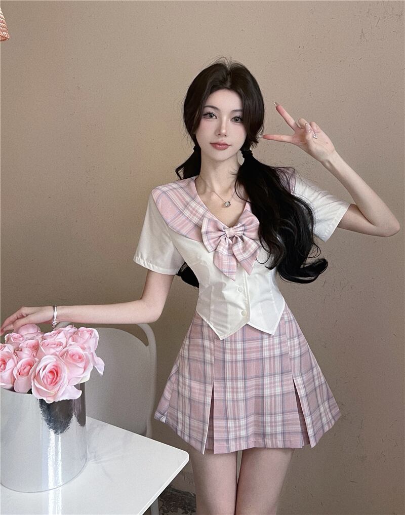 格子柄ネイビーリボンショートシャツ サマースリムトップス 大人ガーリー スウィート キュート カジュアル 夏物 10/5 秋冬 オータム ウインター ナチュラル mi4667357584306