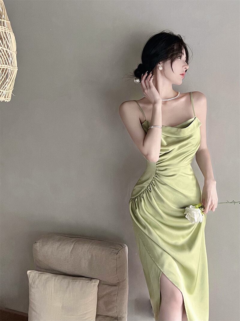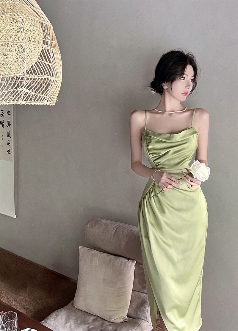 グリーンサテンドレス サマープリーツウェストスリットスカート 夏物 10/5 秋冬 オータム ウインター ナチュラル mi4690541361539