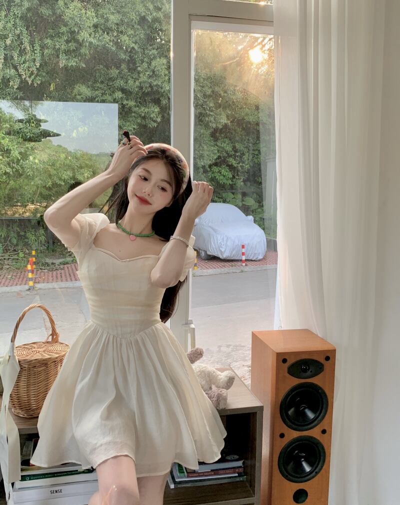 リボンVネックスリーブドレス サマーメッシュウェストAラインスカート 大人ガーリー スウィート キュート カジュアル 夏物 10/5 秋冬 オータム ウインター ナチュラル mi4611494229701