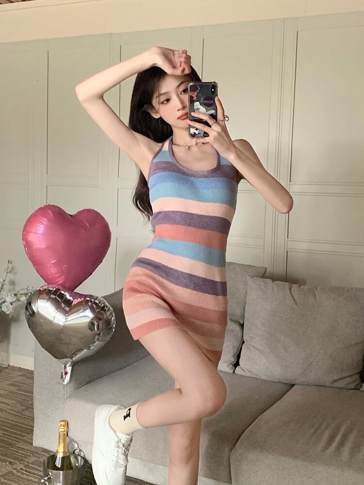 バックレスストライプニットドレス サマースリムウェストショートスカート 夏物 10/5 秋冬 オータム ウインター ナチュラル mi4650708234709