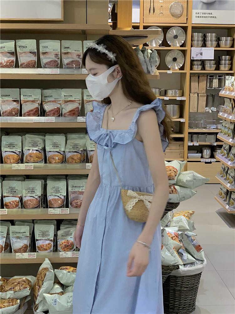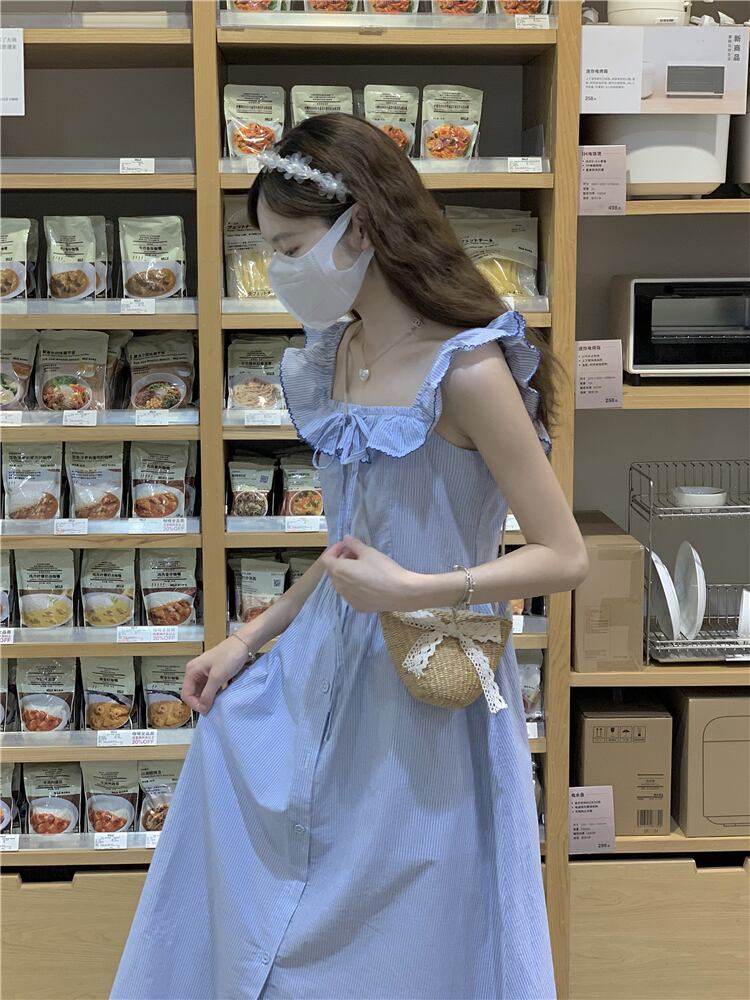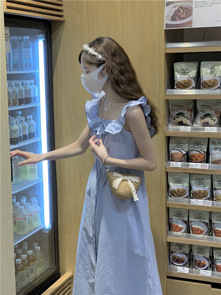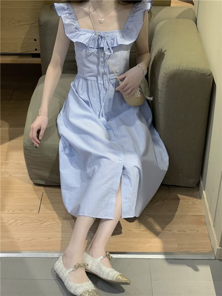 ブルーストライプスリーブドレス サマーウェストAラインスカート レース 夏物 レースアップ スクウェア 10/5 秋冬 オータム ウインター ナチュラル mi4690899774167