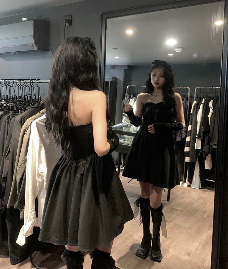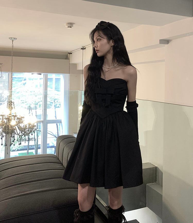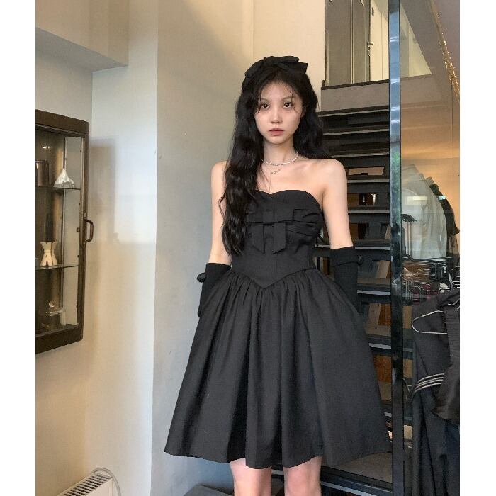ブラックリボントップス ドレス サマープリーツウェストAラインスカート 夏物 10/5 秋冬 オータム ウインター ナチュラル mi4644772920193