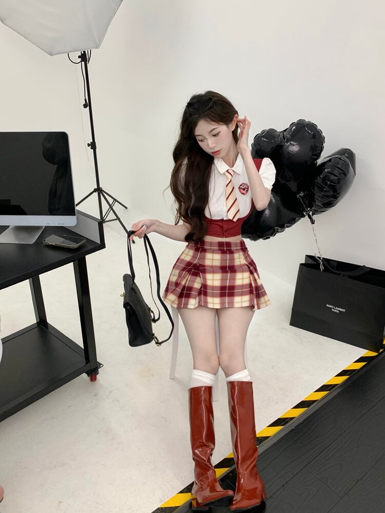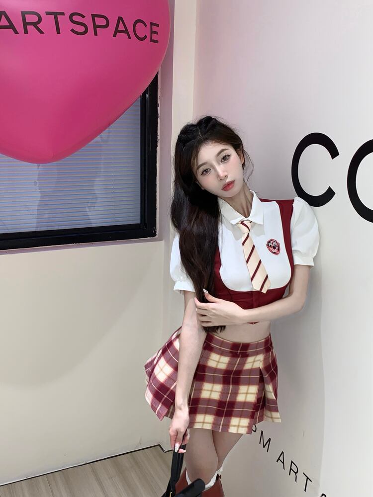 色:ネクタイワンピース,偽の2つのシャツ,チェック柄スカート