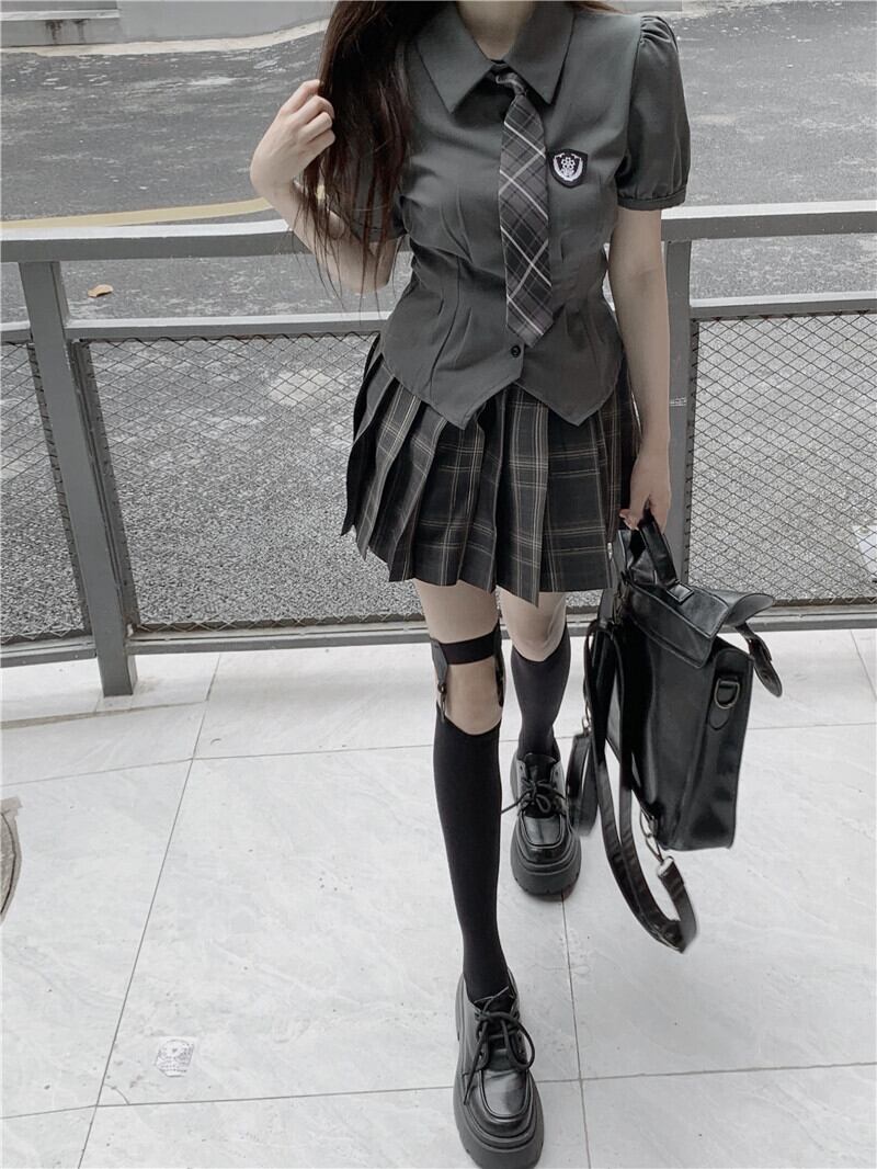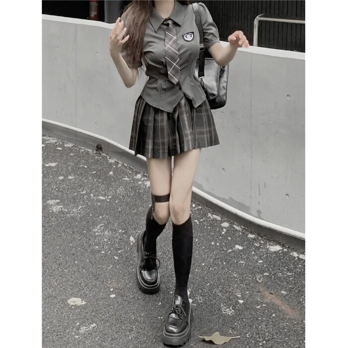 色:ダークグレーのトップス,ホワイトトップシングルピース,シングルプリーツスカート