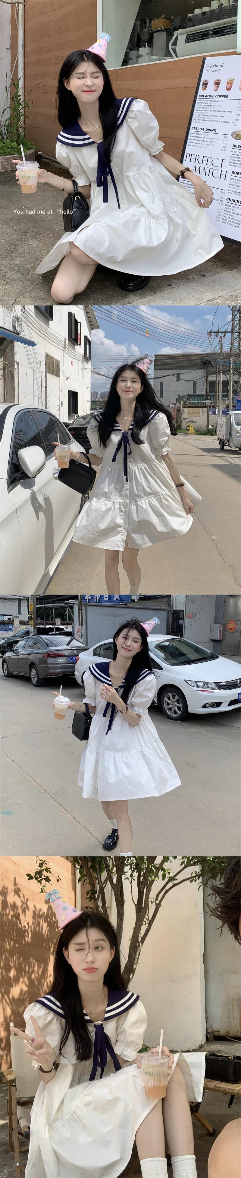 レースネイビーカラードレス サマースリーブウェストAラインスカート 夏物 10/5 秋冬 オータム ウインター ナチュラル mi4689199962627