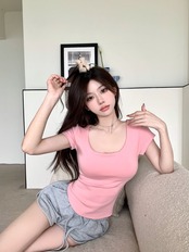 ショートTシャツ サマースリムトップス ピンク 夏物 10/5 秋冬 オータム ウインター ナチュラル mi4635930817807