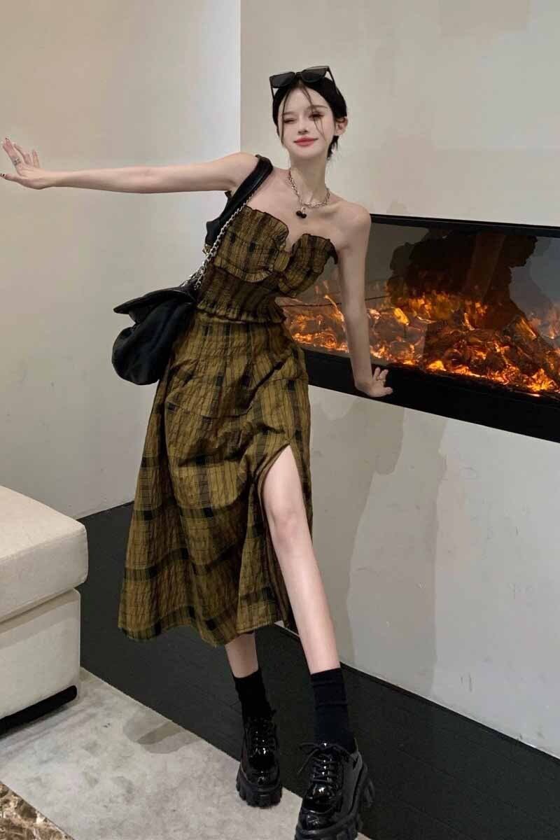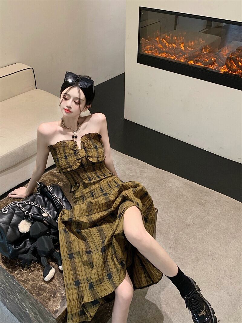 色:チェック柄チューブトップワンピース,チェック柄スカート