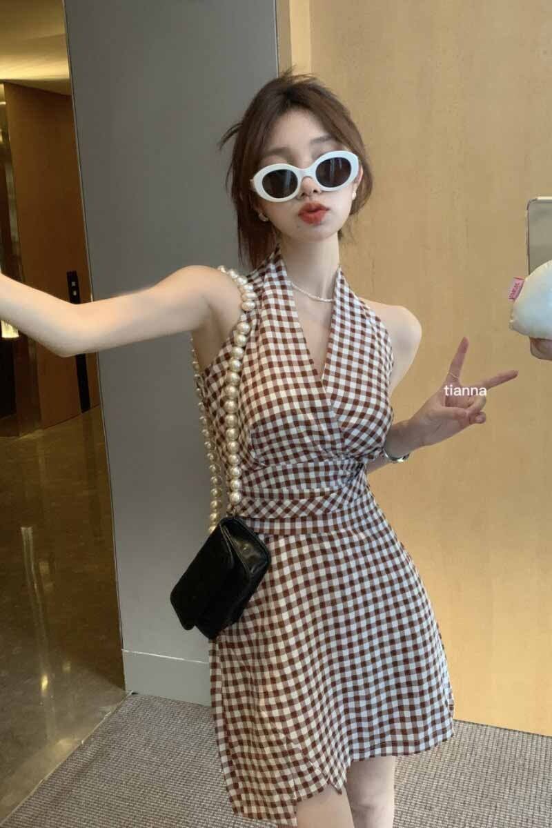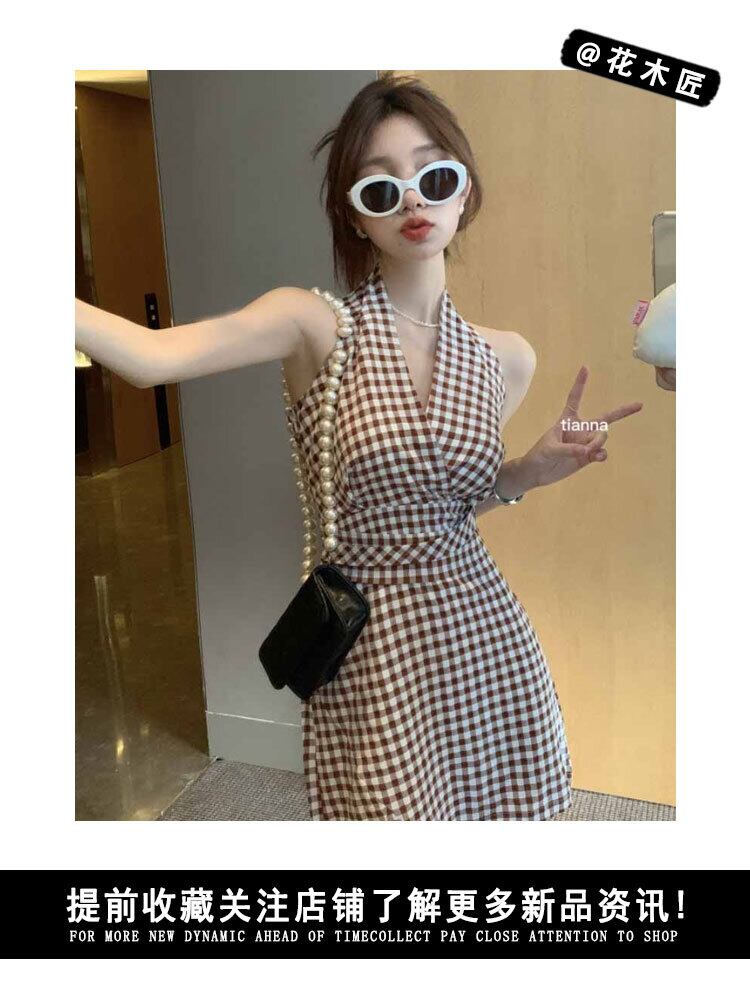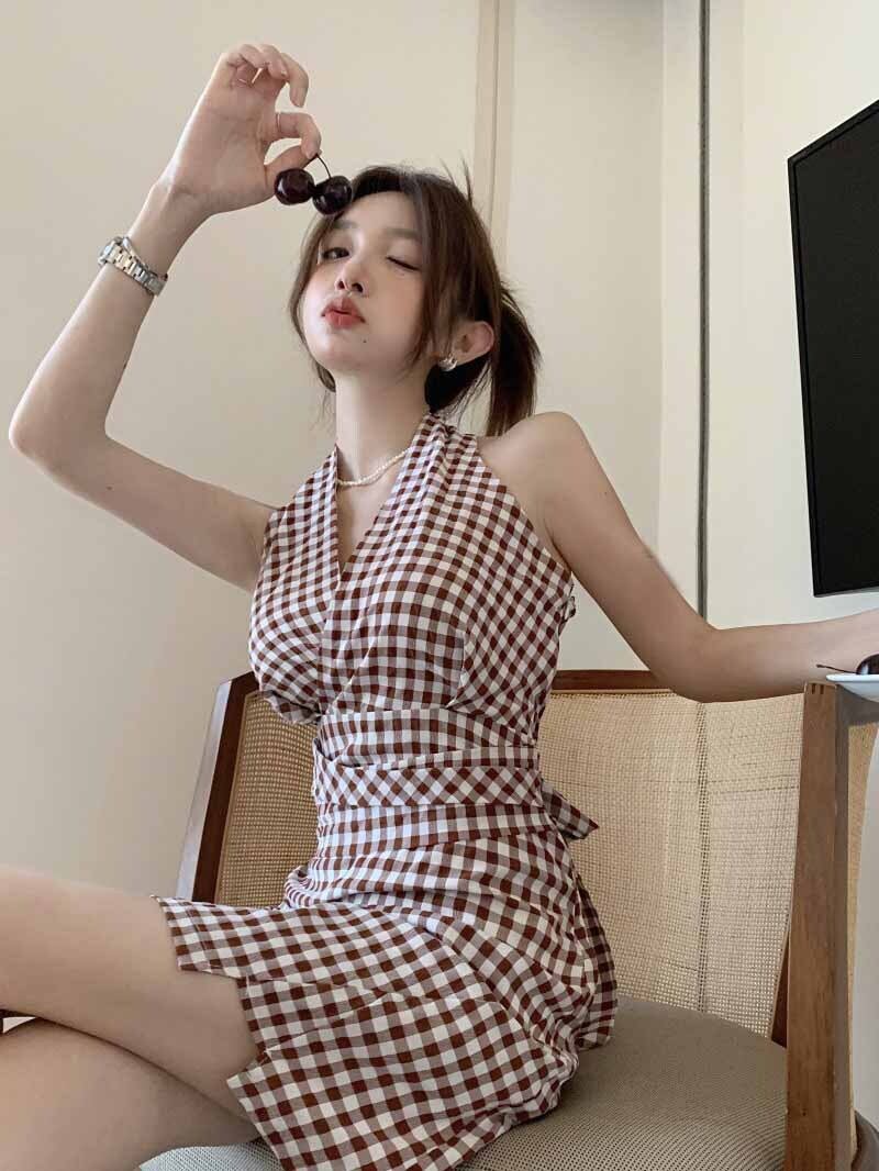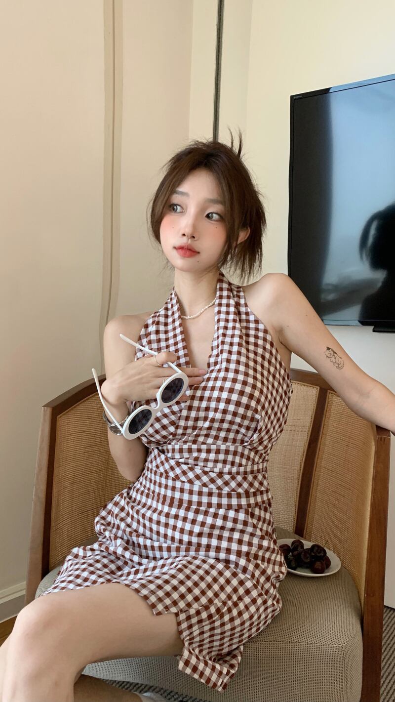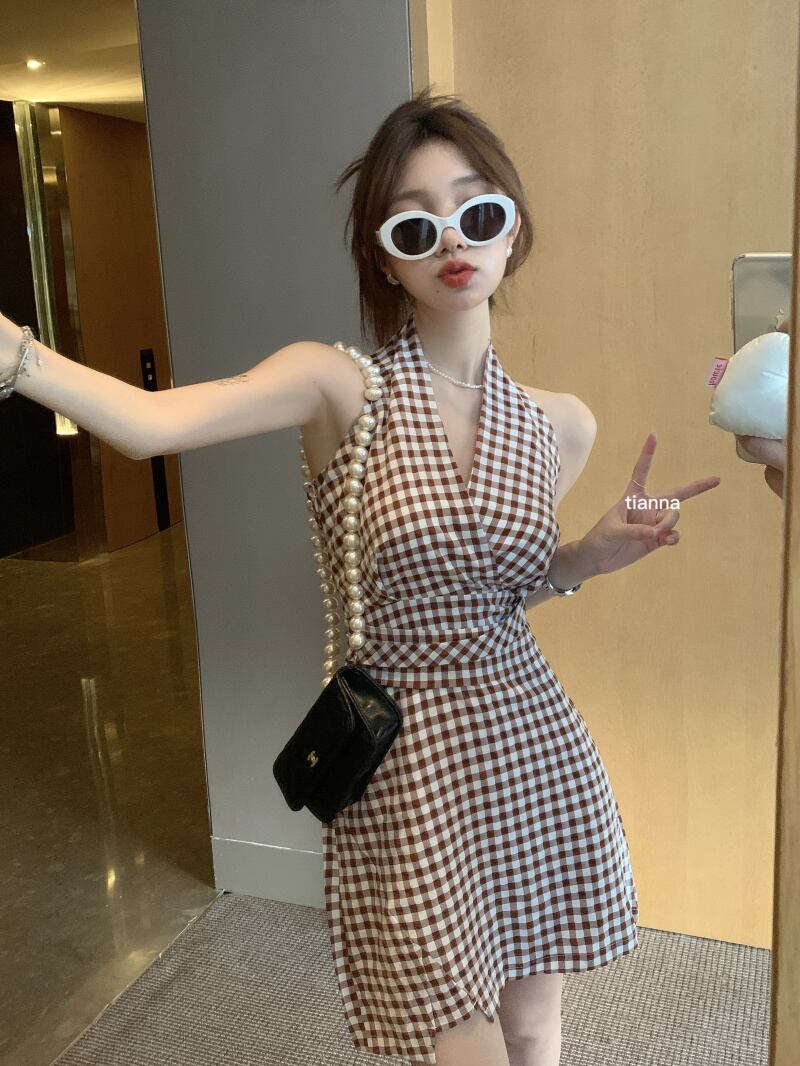 バックレス格子柄ホルタードレス サマーVネックAラインスカート 夏物 10/5 秋冬 オータム ウインター ナチュラル mi4662436459855