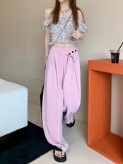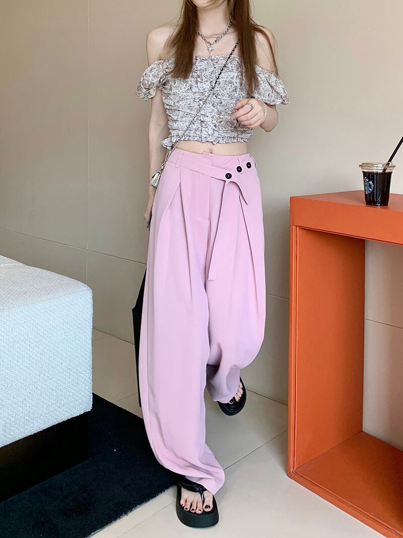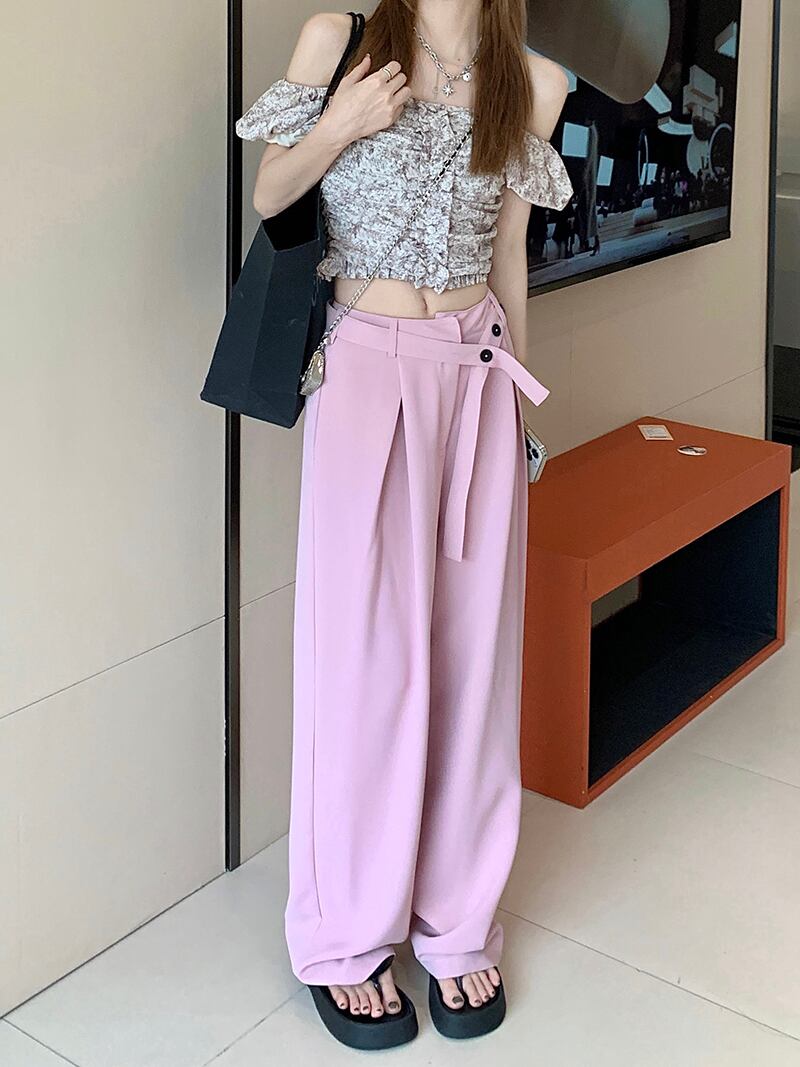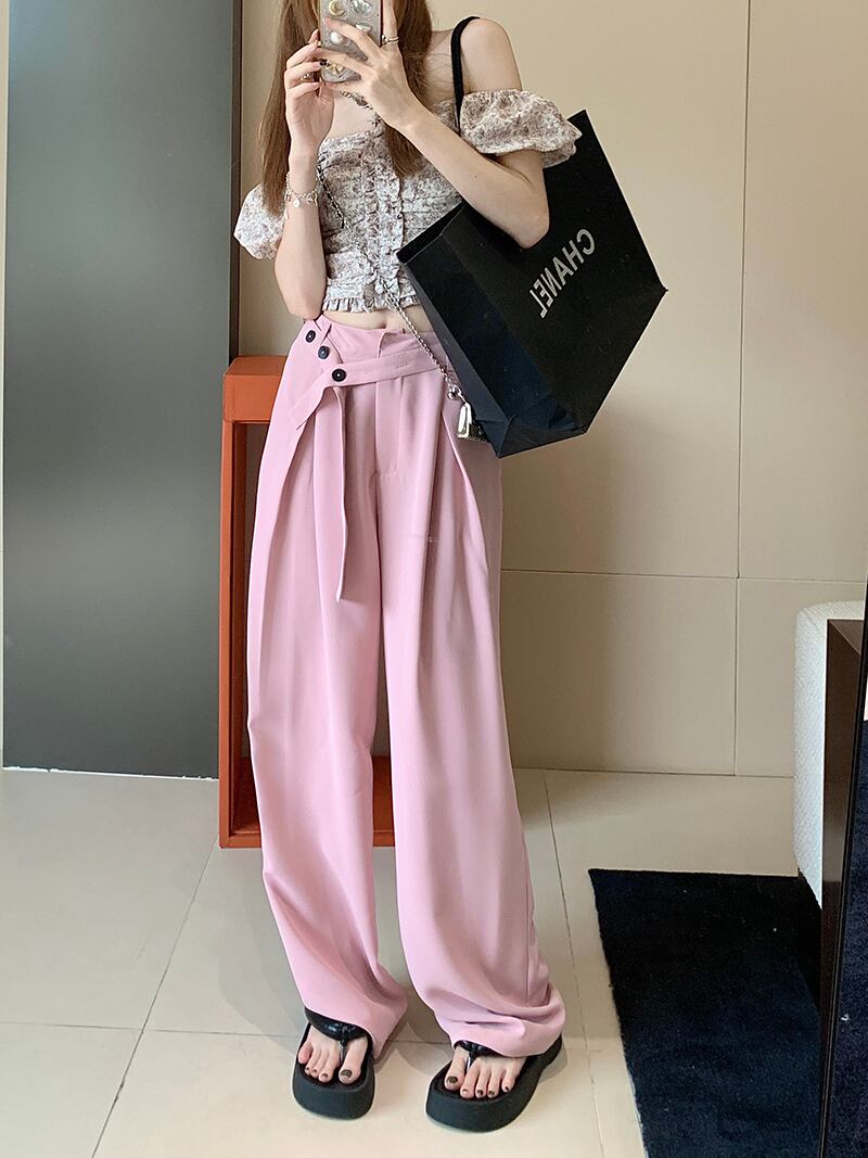 ストラップ カジュアルパンツ オータムハイウェスト薄手 ピンク 秋物 10/5 秋冬 オータム ウインター ナチュラル mi4626595991860
