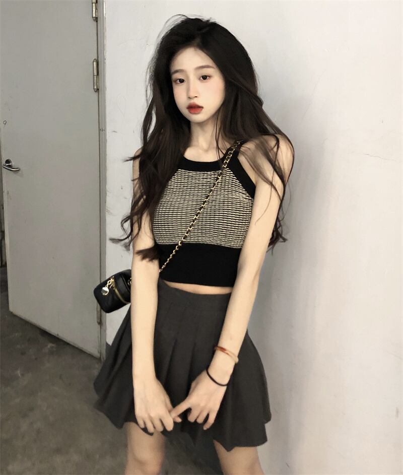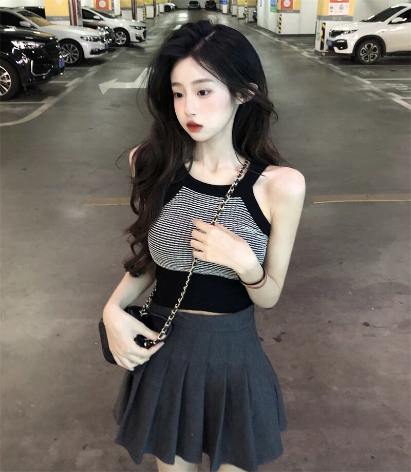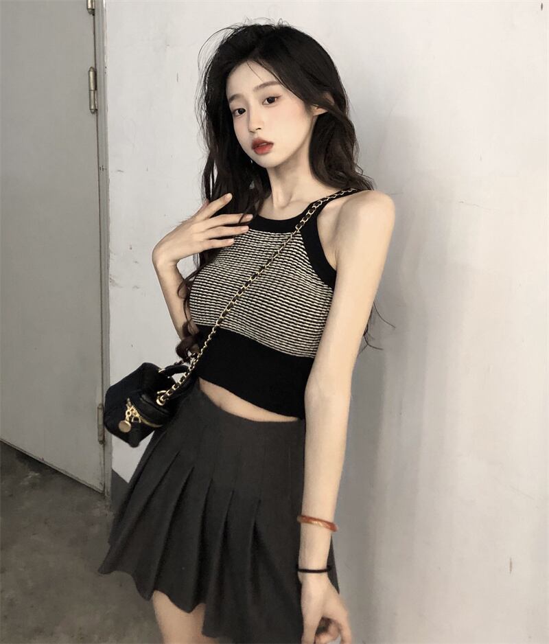 スタンダードストライプサマースタイルスリムショートノースリーブトップス レトロ 半袖 ハーフスリーブ 夏物 10/5 秋冬 オータム ウインター ナチュラル mi4637907981268