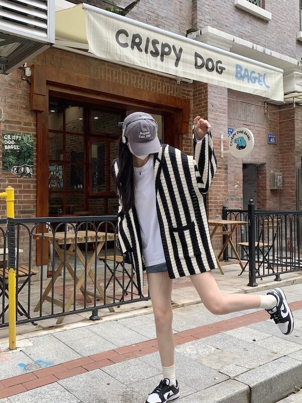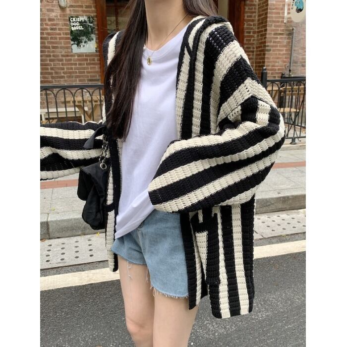 フードストライプセーター コート オータムルーズニットカーディガントップス ロング 秋物 10/5 秋冬 オータム ウインター ナチュラル mi4621551010063