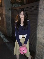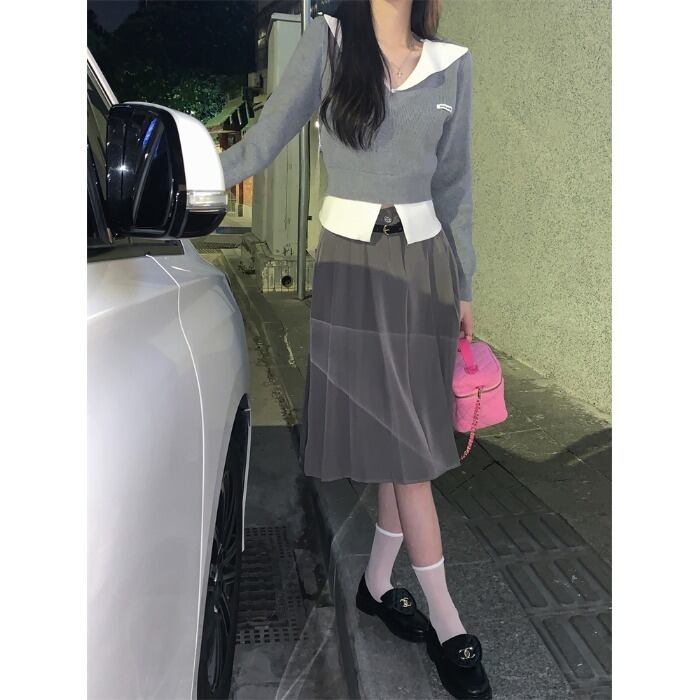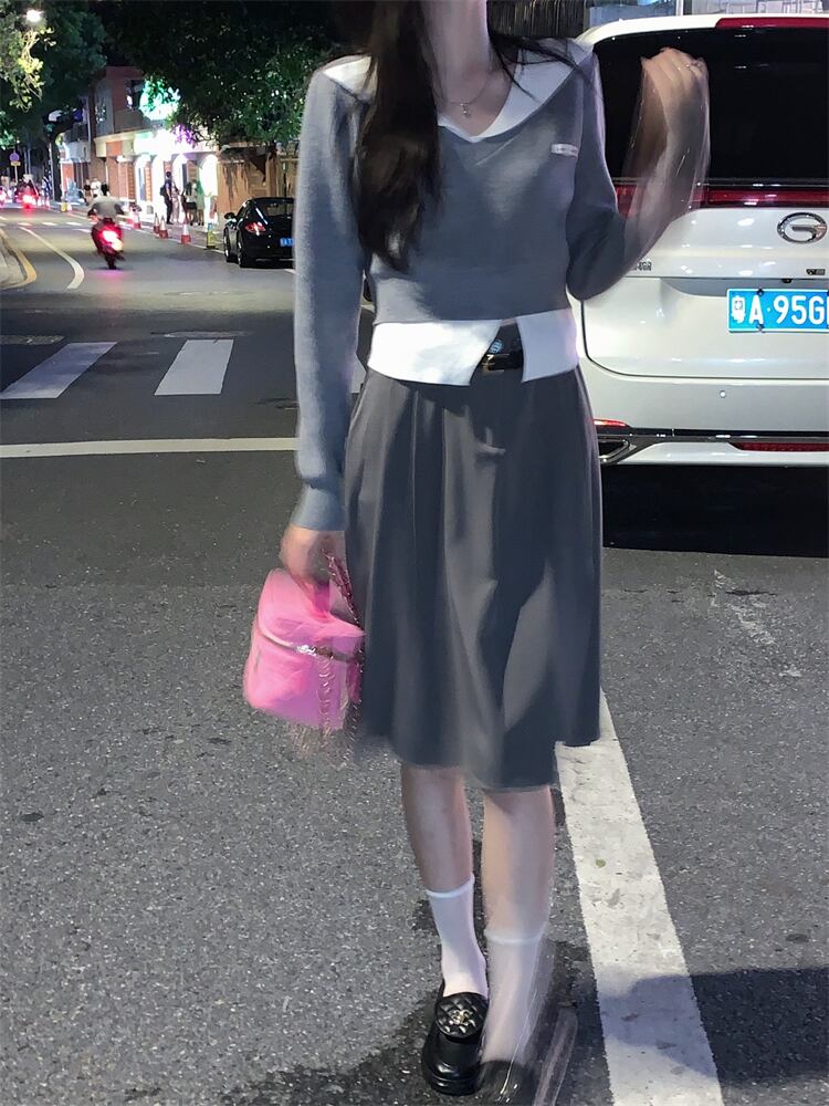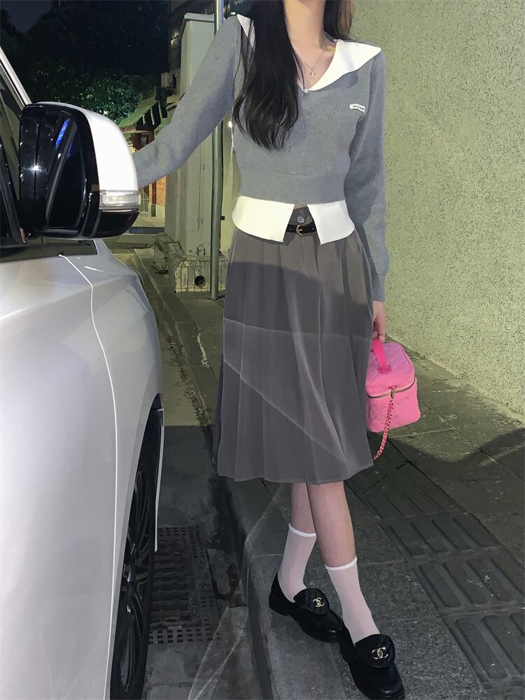 色:グレートップシングルピース,ネイビーブルーのシャツ,グレーハーフスカートワンピース,カードカラースカートワンピース