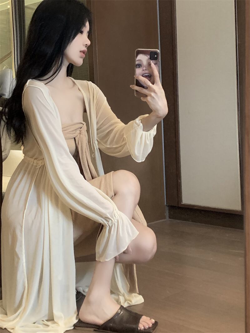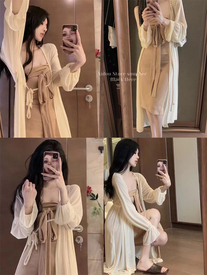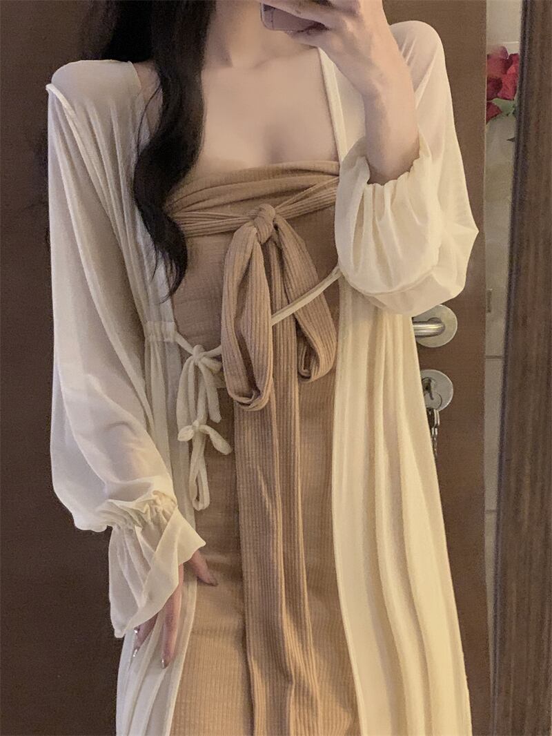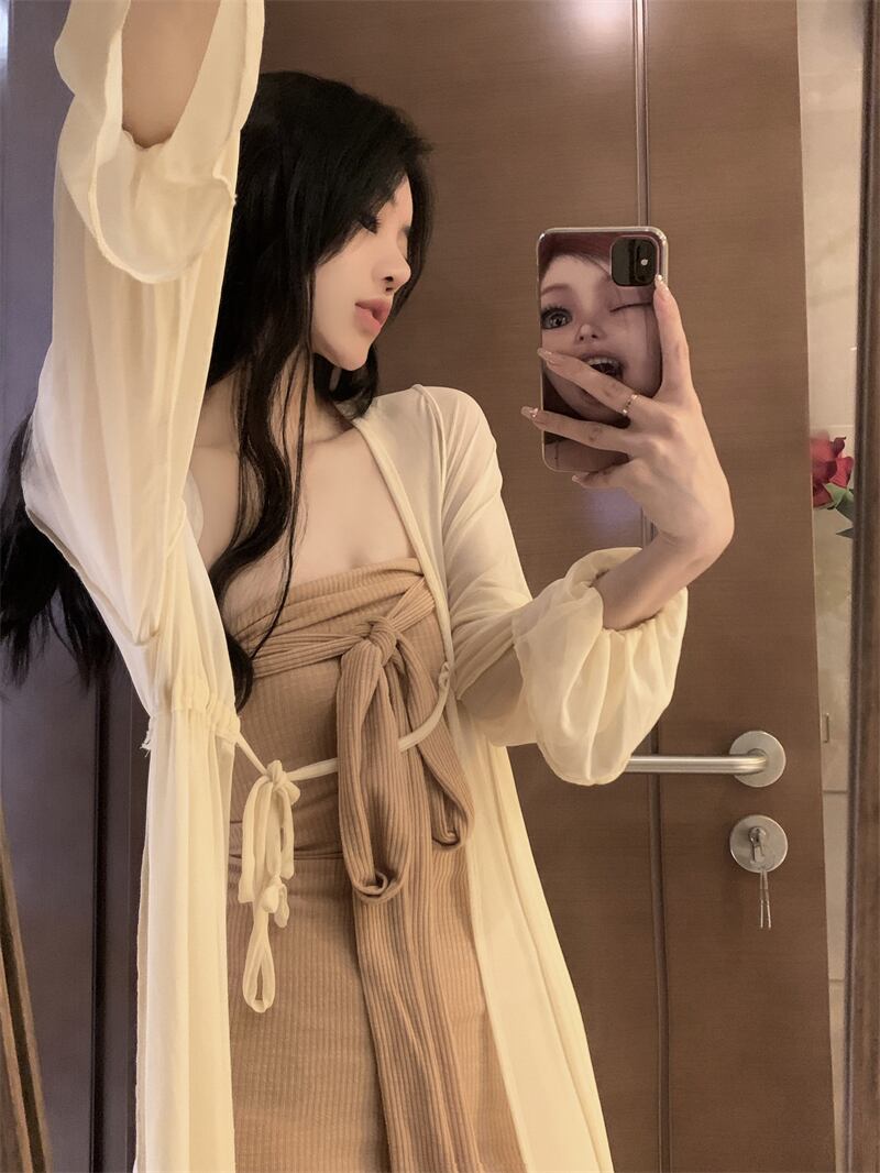 色:ピーナッツカラーチューブドレス,ワンピースアプリコットカーディガン