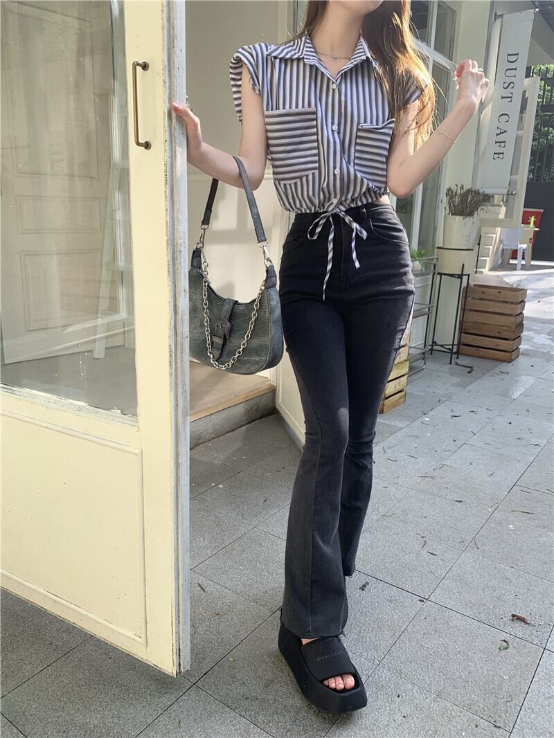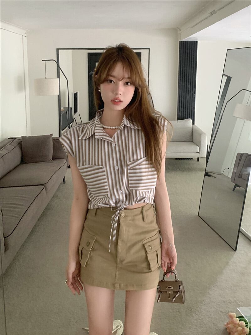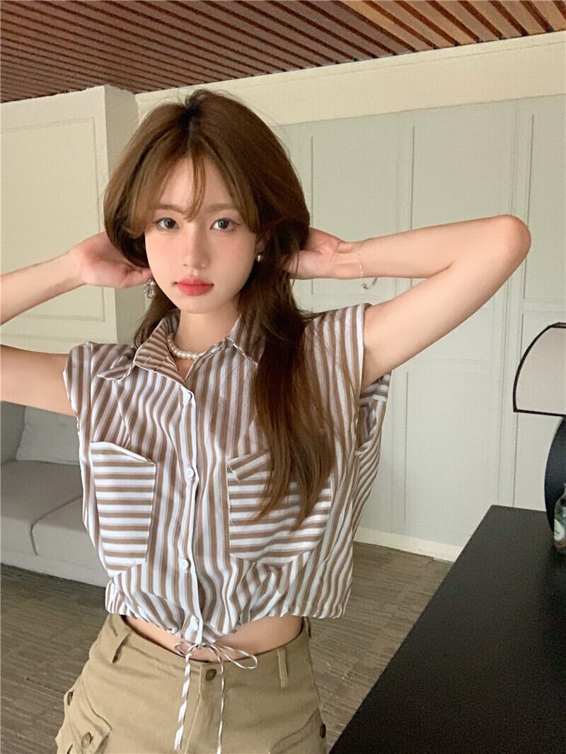 スタンダードストライプショートシャツ サマールーズトップス レトロ レース 夏物 レースアップ 10/5 秋冬 オータム ウインター ナチュラル mi4684363651900