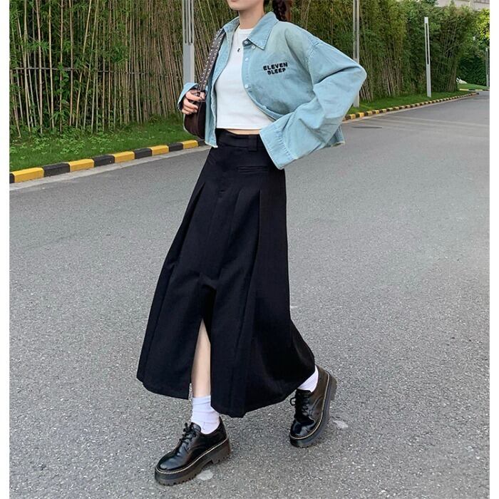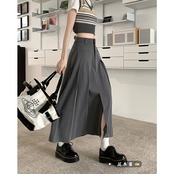 スタンダードグレーAラインスカート オータムプリーツハイウェストウェストスタイルロング レトロ 秋物 10/5 秋冬 オータム ウインター ナチュラル mi4612939258464