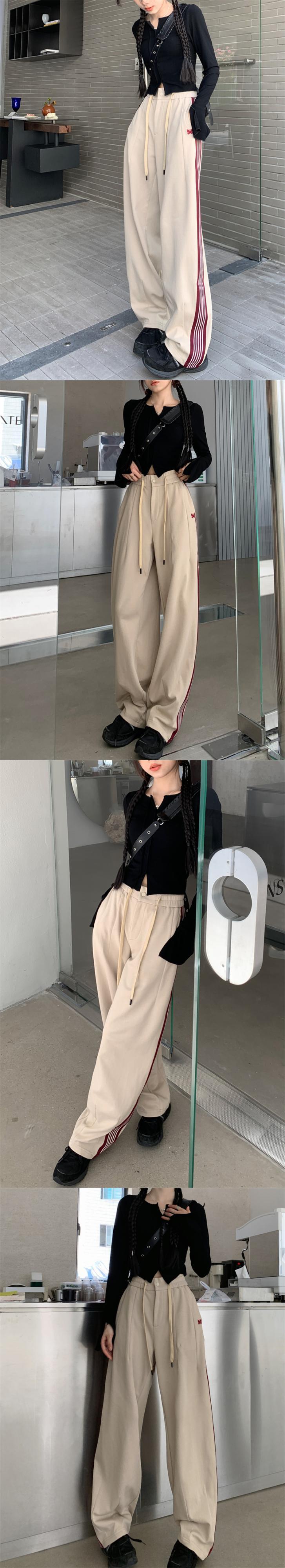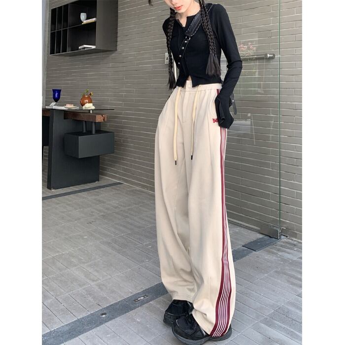 Butterflyデザイン 刺繍カラーストライプカジュアルパンツ オータムハイウェストウェスト薄手ルーズワイドレッグ 秋物 ワイドパンツ 10/5 秋冬 オータム ウインター ナチュラル mi4644607245961