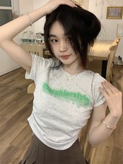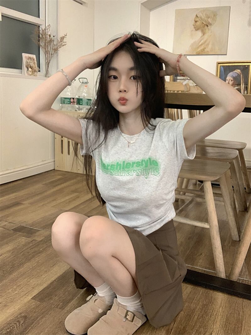 スリムフィット薄手ショートTシャツ サマープリント柄トップス 夏物 10/5 秋冬 オータム ウインター ナチュラル mi4611536405298