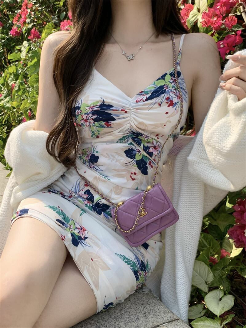 色:花柄ドレス,ベージュカーディガン