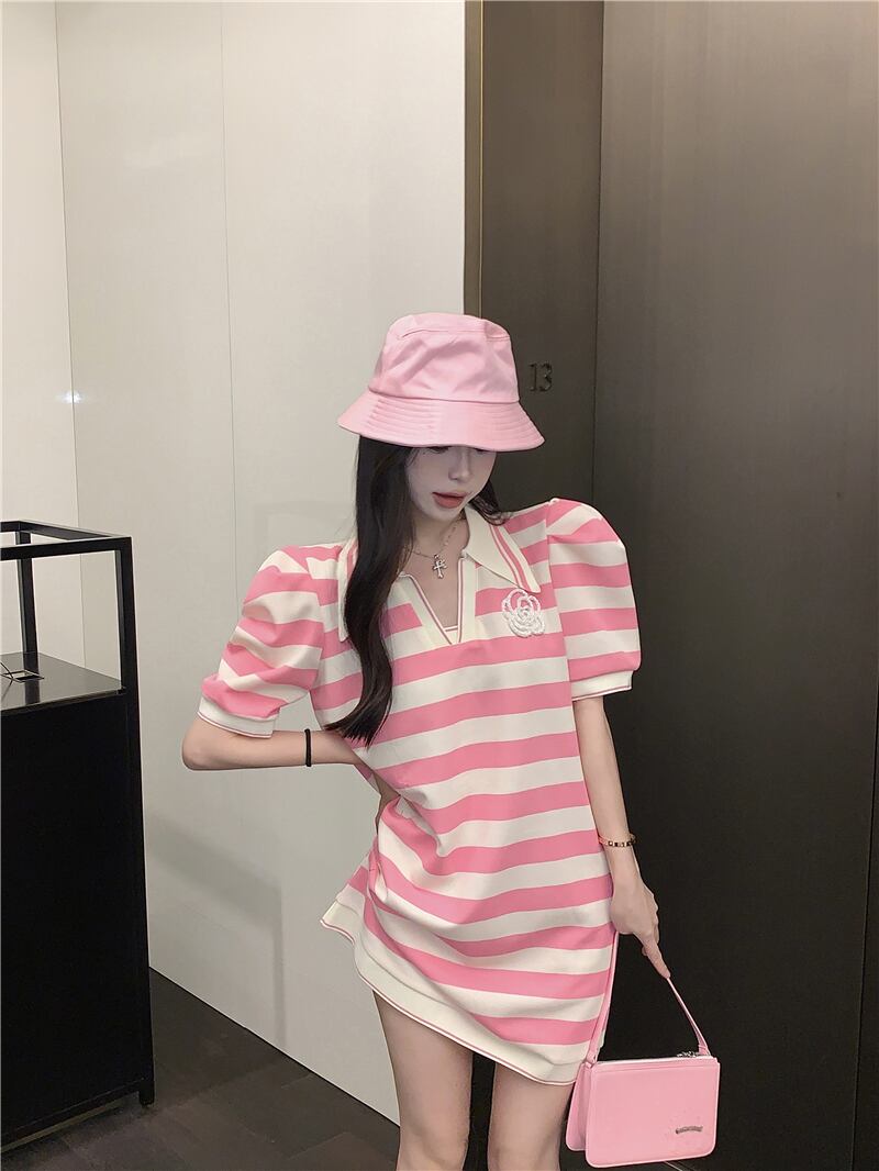 ストライプドレス サマールーズ薄手Aラインスカート ピンク 大人ガーリー スウィート キュート カジュアル 夏物 10/5 秋冬 オータム ウインター ナチュラル mi4632421750092