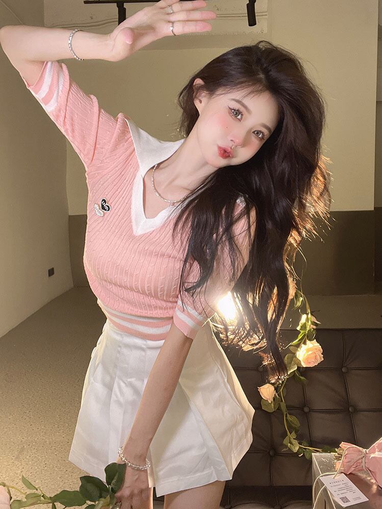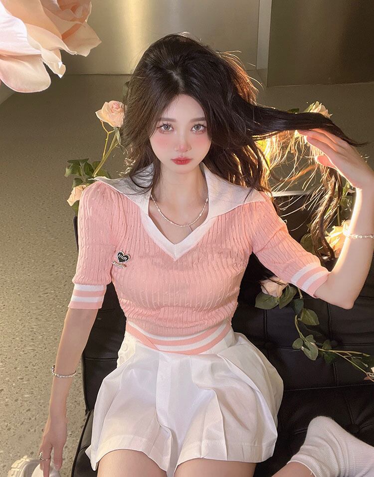 ブローチ ショートTシャツ サマースタイルスリムニットトップス 大人ガーリー スウィート キュート カジュアル 夏物 10/5 秋冬 オータム ウインター ナチュラル mi4611683728056