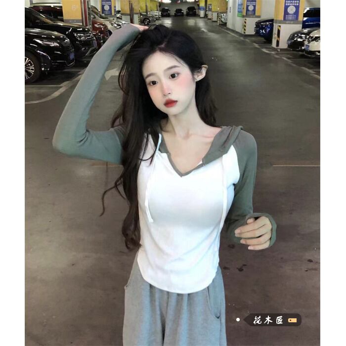 カラーギャザーフードTシャツ オータムスリムフィットショートトップス ロング 大人ガーリー スウィート キュート カジュアル 秋物 10/5 秋冬 オータム ウインター ナチュラル mi4669503530694