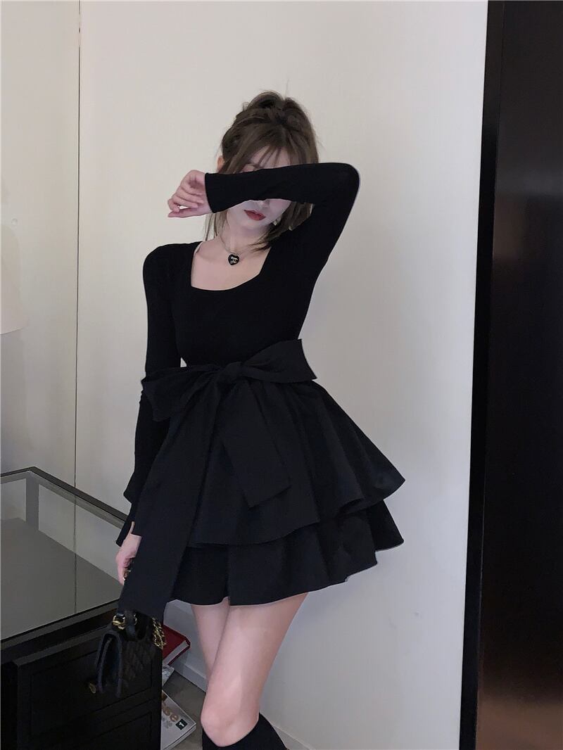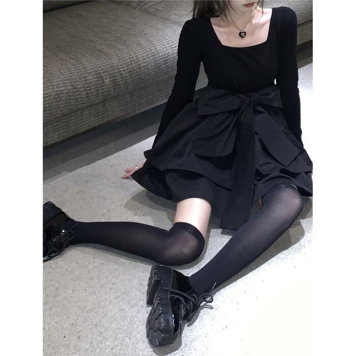 スタイルリボンドレス オータムウェスト薄手ブラックスカート ふわふわ 秋物 スクウェア 10/5 秋冬 オータム ウインター ナチュラル mi467210715566