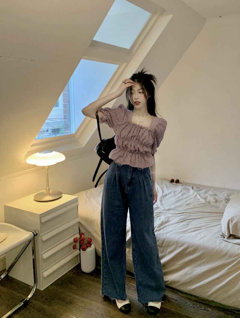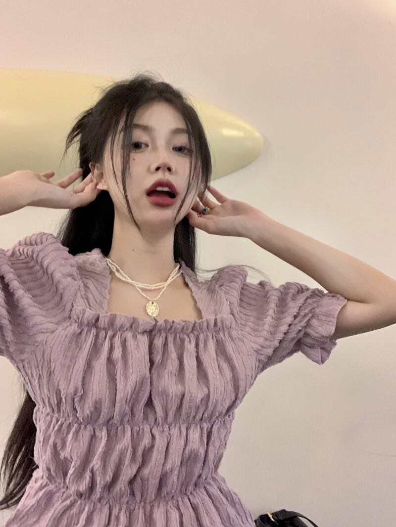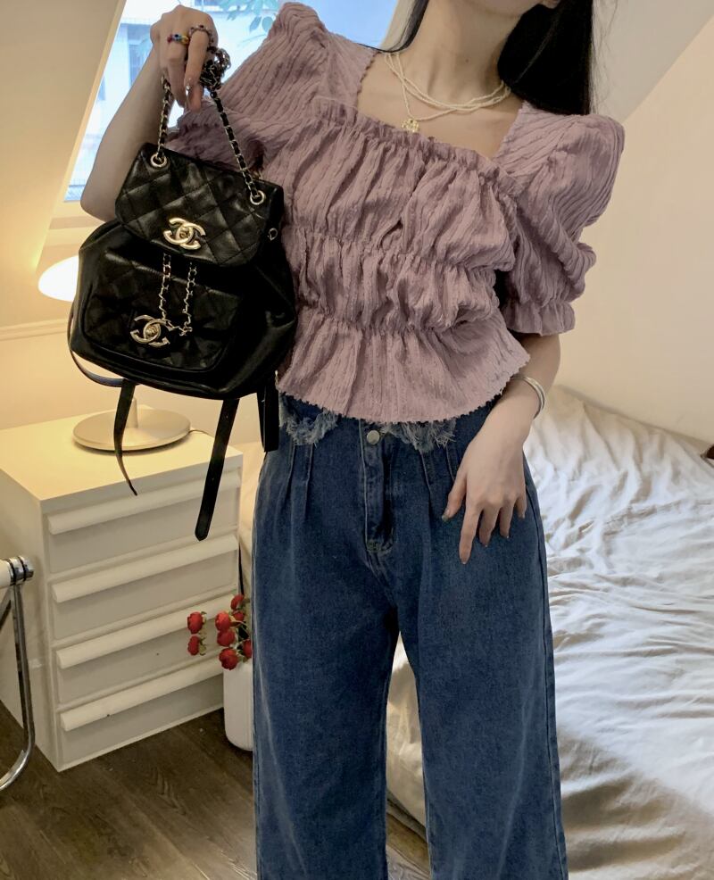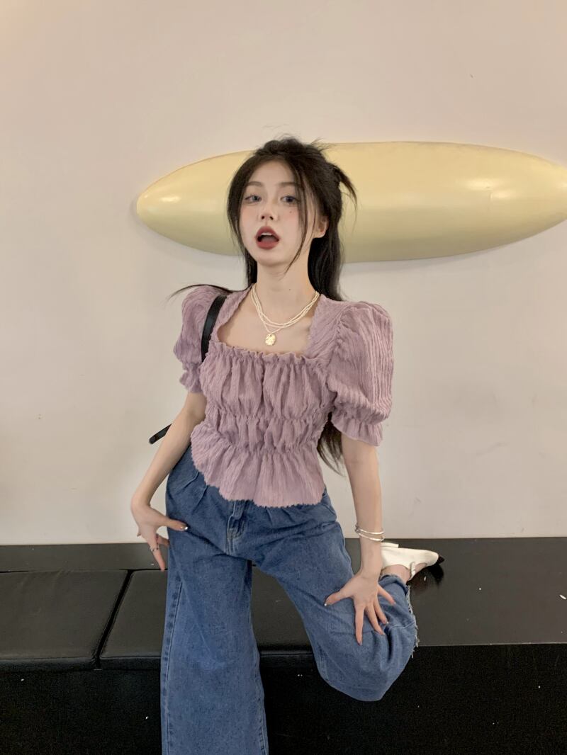 シャツ サマースリムプリーツショートトップス 夏物 パープル スクウェア 10/5 秋冬 オータム ウインター ナチュラル mi4624173581236