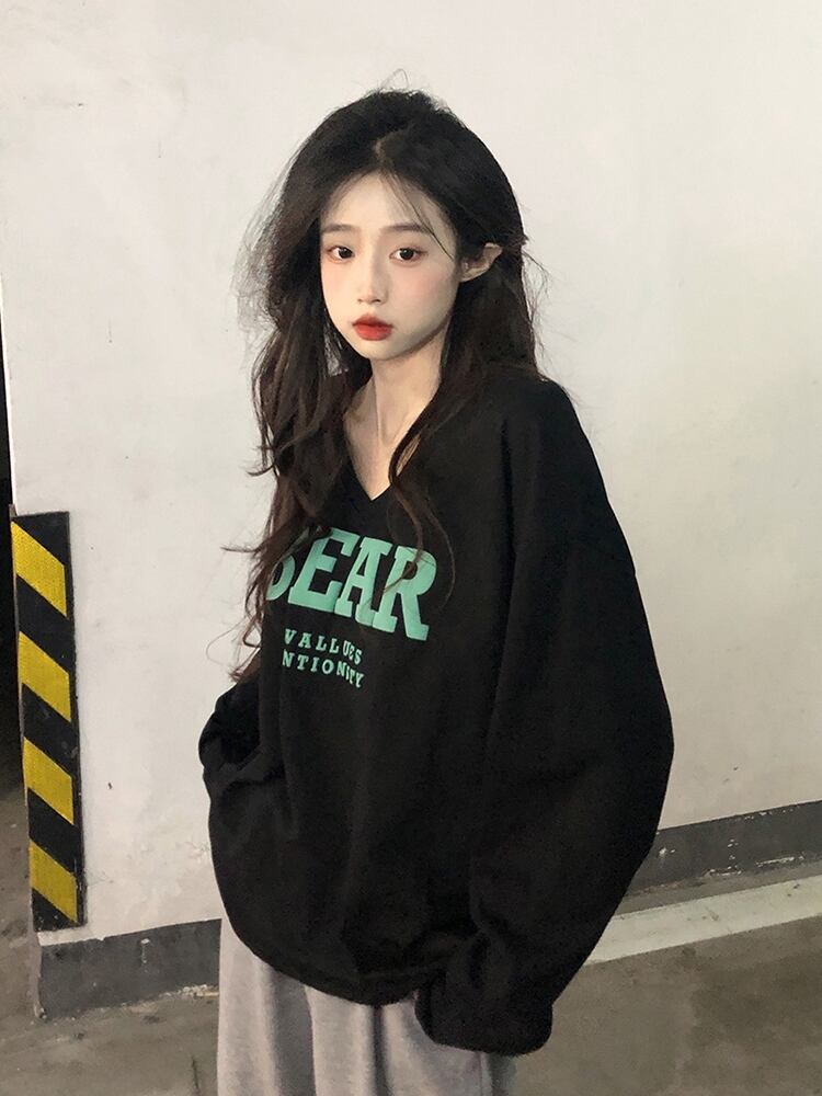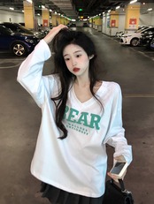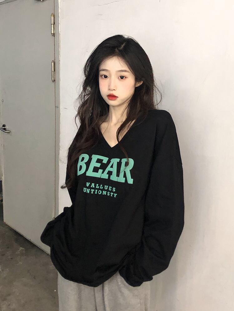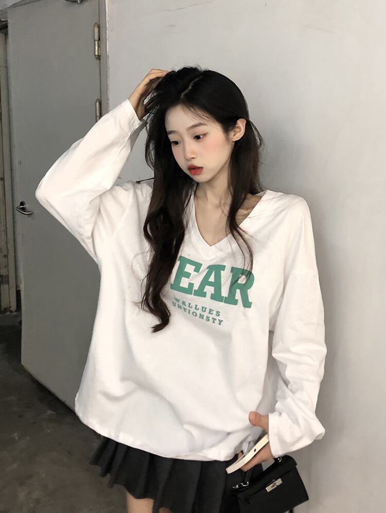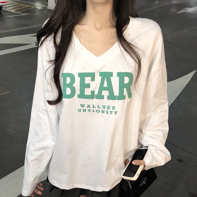 スタイルVネックプリントTシャツ オータムルーズトップス ロング 秋物 10/5 秋冬 オータム ウインター ナチュラル mi4656560999679