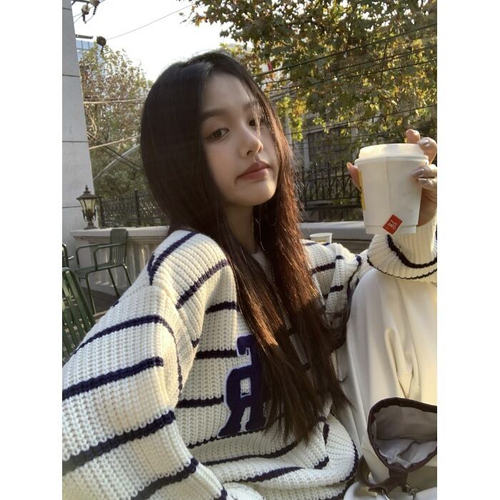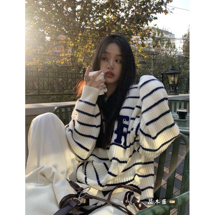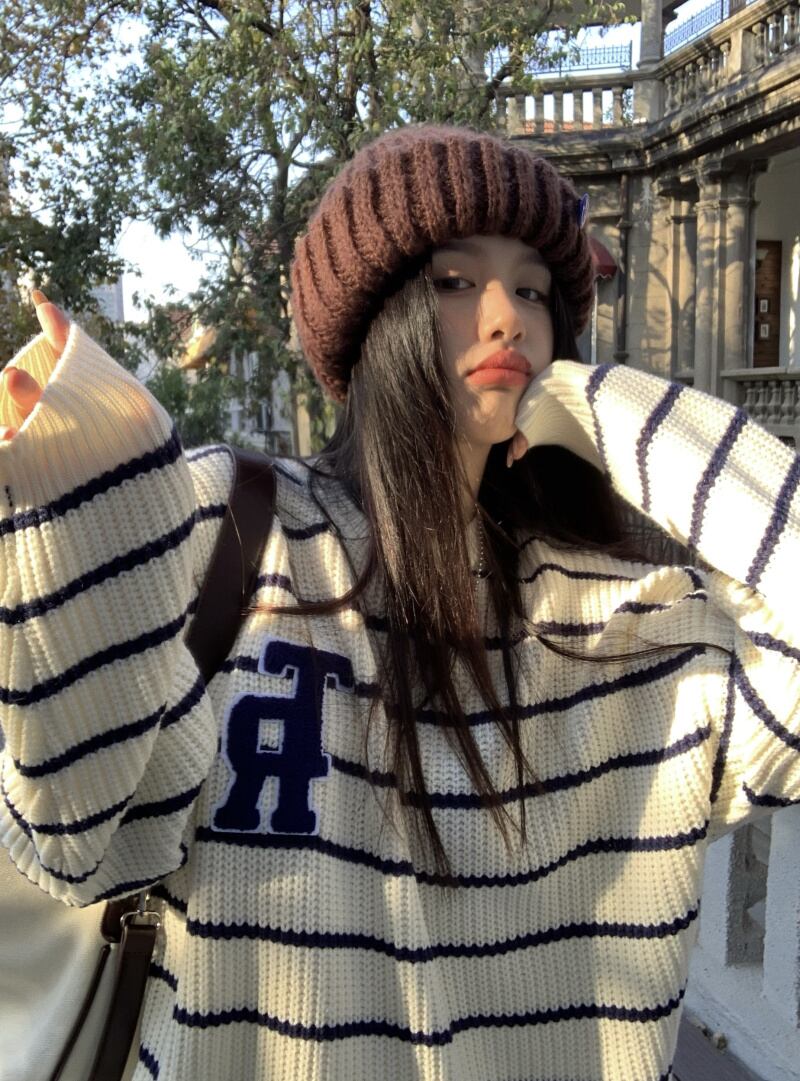 カラーストライププリント柄セーター オータムルーズプルオーバー 秋物 10/5 秋冬 オータム ウインター ナチュラル mi4623624462436