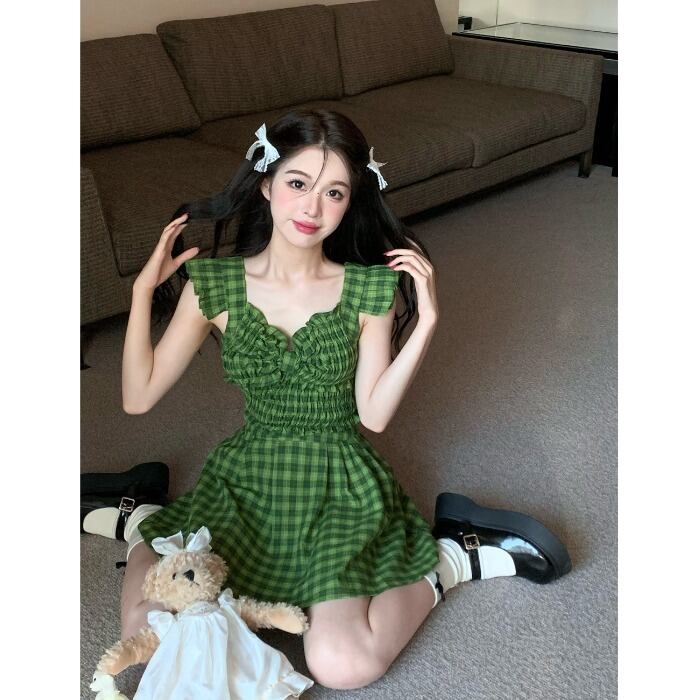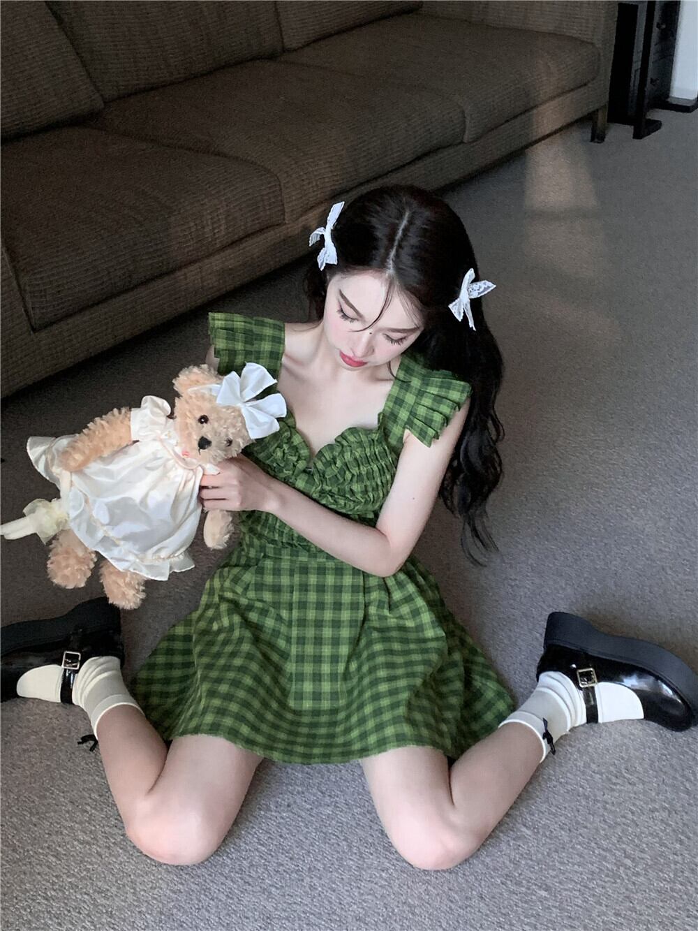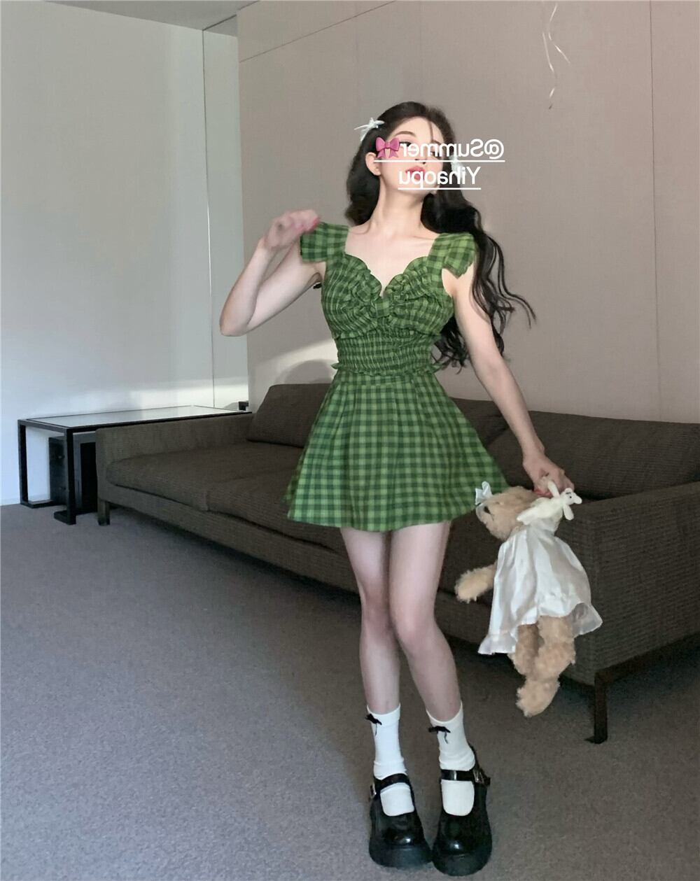 グリーン格子柄スタイルスリーブトップス サマースカート セット 大人ガーリー スウィート キュート カジュアル 夏物 10/5 秋冬 オータム ウインター ナチュラル mi4632743465498