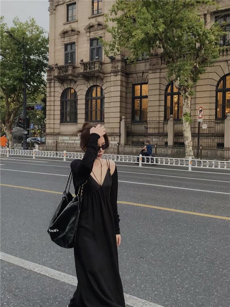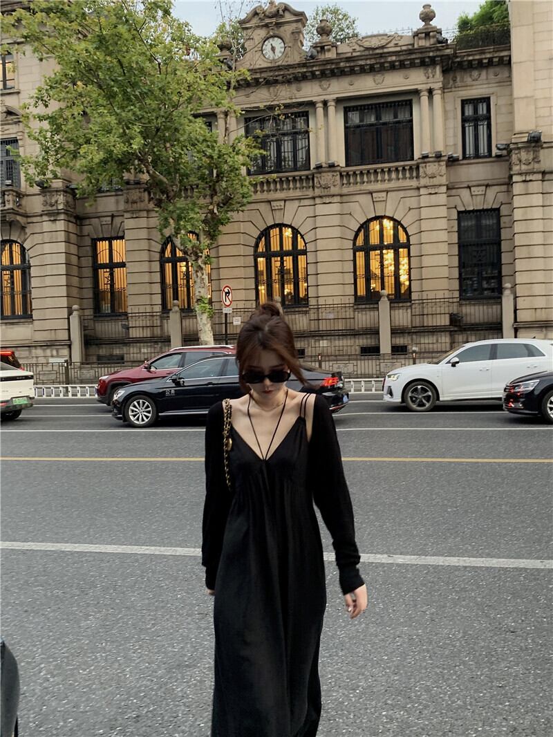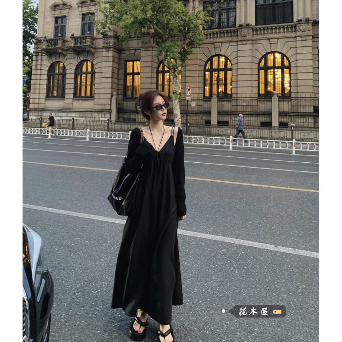 Vネックドレス オータムスタイルルーズ薄手Aラインスカート 秋物 10/5 秋冬 オータム ウインター ナチュラル mi4677360888944