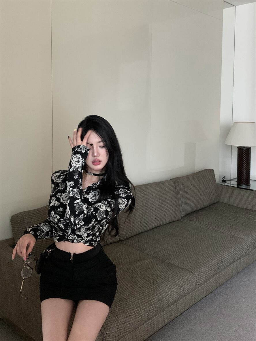 スタンダードフローラルシャツ オータムスリムショートトップス ロング レトロ 秋物 花柄 10/5 秋冬 オータム ウインター ナチュラル mi4655014584711