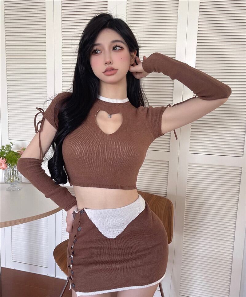 色:ピンクスリーブワンピース,ブラウンスリーブワンピース,ピンクのラブトップ,ブラウンハートトップ,ピンクバイアスボタンスカート,ブラウンバイアススカート