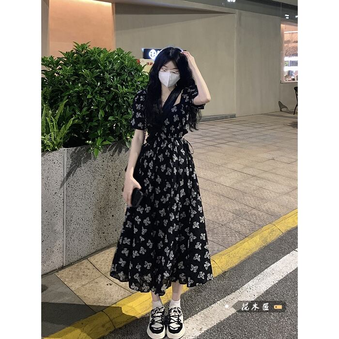スタンダードスリーブドレス サマーリボンプリント柄ウェストスカート レトロ 夏物 スクウェア 10/5 秋冬 オータム ウインター ナチュラル mi464424921249