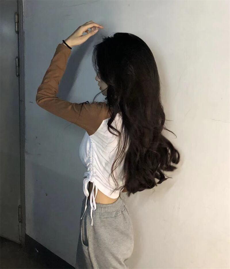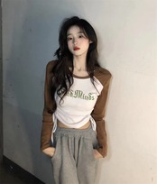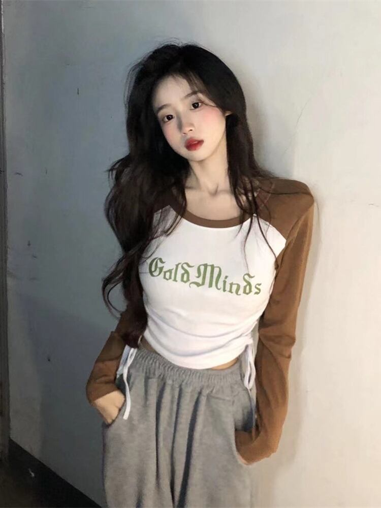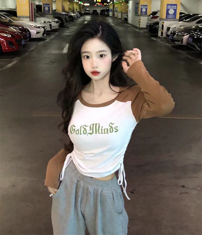 スタンダードカラープリント柄Tシャツ オータムギャザーショートトップス ロング レトロ 秋物 10/5 秋冬 オータム ウインター ナチュラル mi4626429193720