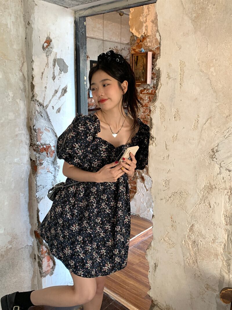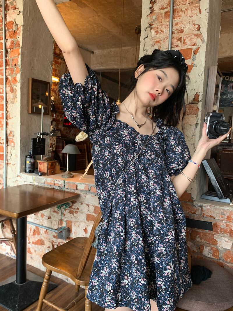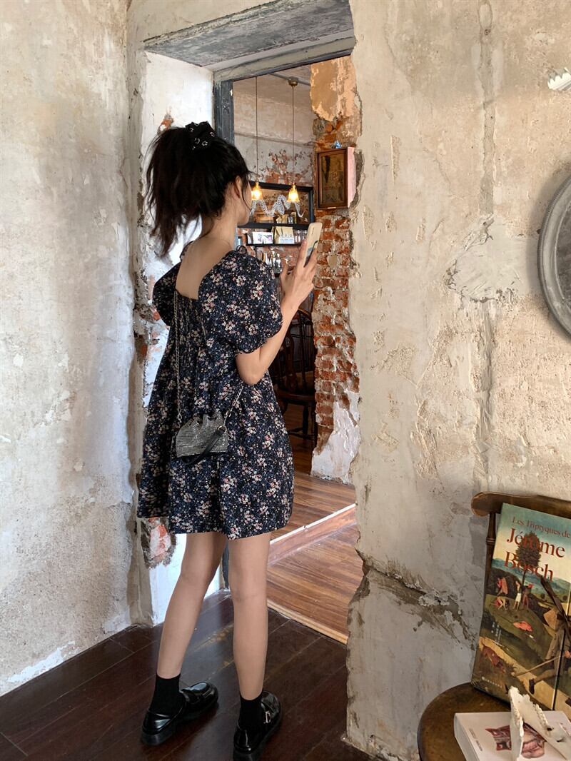 フローラルスリーブドレス サマースタンダードルーズプリーツショートスカート レトロ 夏物 花柄 10/5 秋冬 オータム ウインター ナチュラル mi4643364625952
