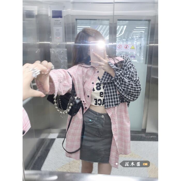 格子柄シャツ オータム薄手トップス ロング ピンク 秋物 ステッチ 10/5 秋冬 オータム ウインター ナチュラル mi4642086807831