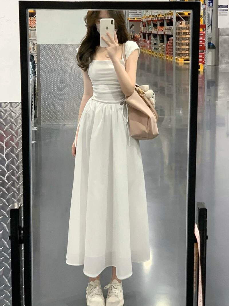 カラーハイウェストウェスト薄手半袖スリーブドレス サマースカート ショート ハーフスリーブ 夏物 スクウェア 10/5 秋冬 オータム ウインター ナチュラル mi4659957333030