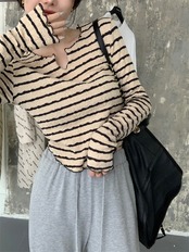 カラーストライプTシャツ オータムショートトップス ロング 秋物 10/5 秋冬 オータム ウインター ナチュラル mi4625085529400