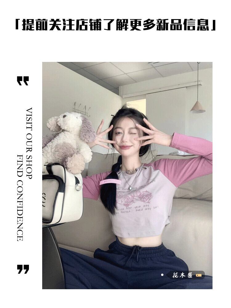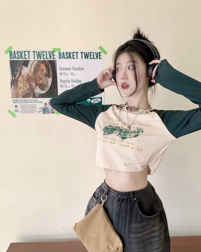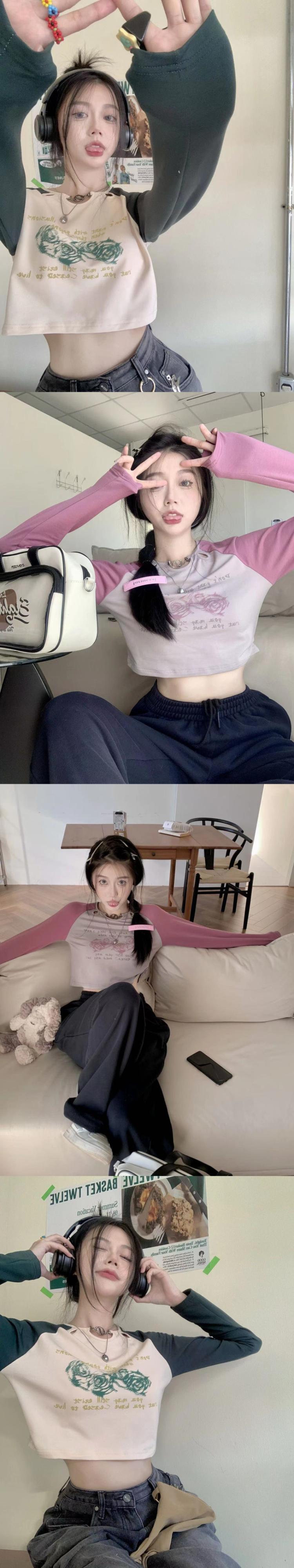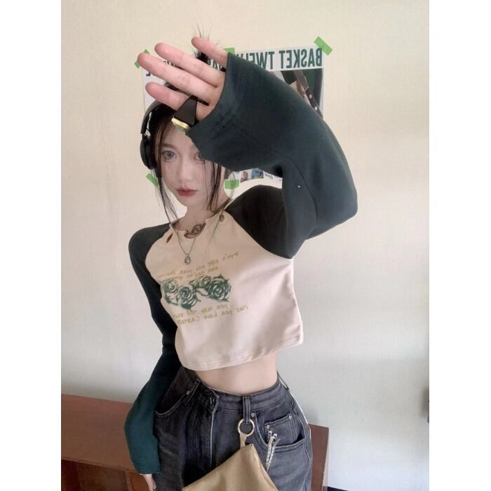 カラープリント柄Tシャツ オータムスリムショートトップス ロング 秋物 10/5 秋冬 オータム ウインター ナチュラル mi4695020034369