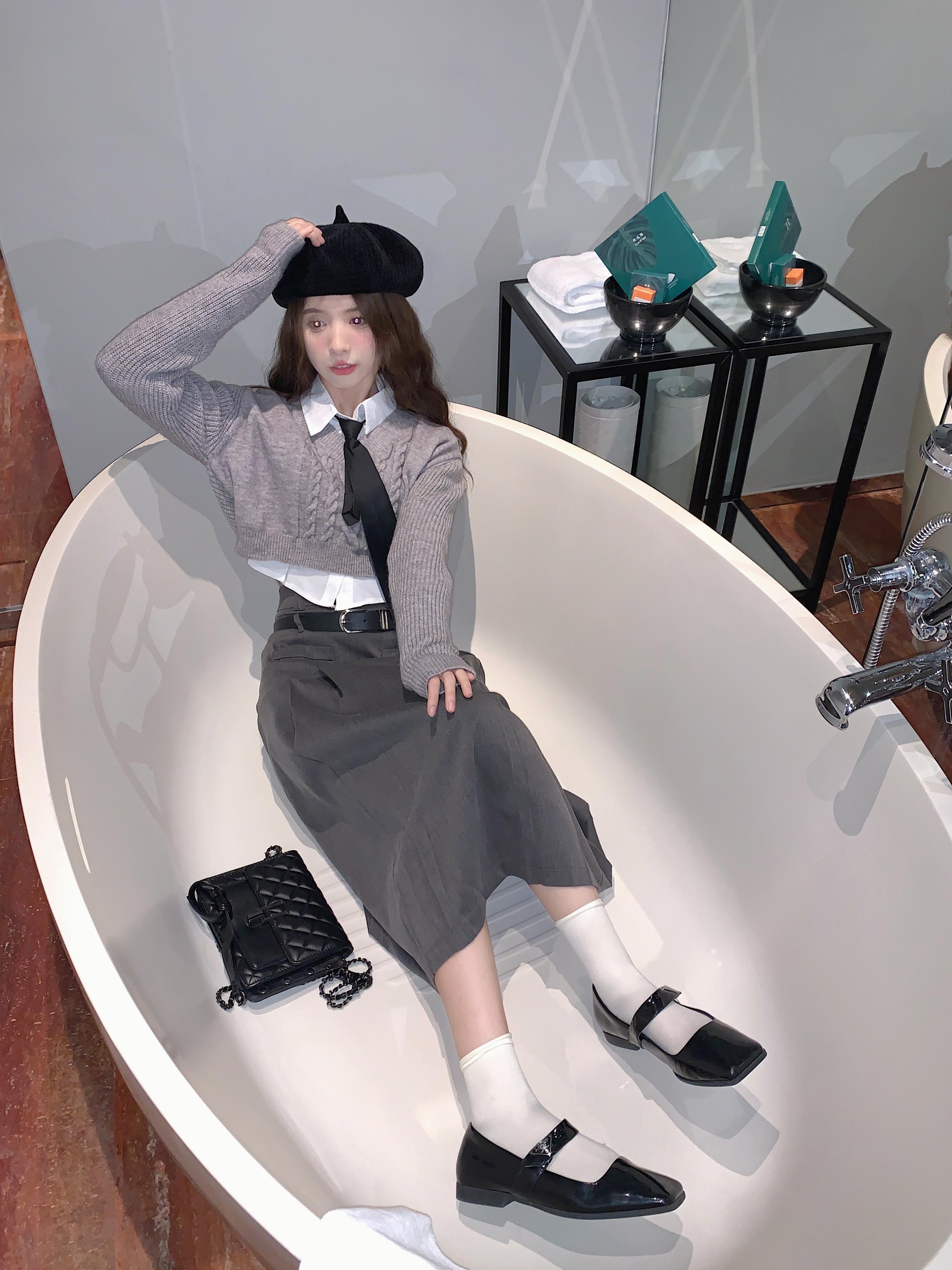 色:白いシャツ+ネクタイ,グレーセーターワンピース,グレースカート+ベルト