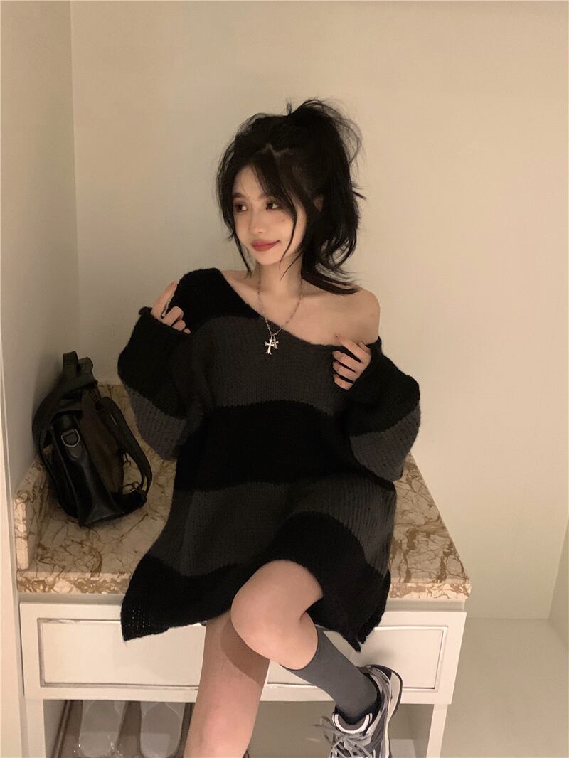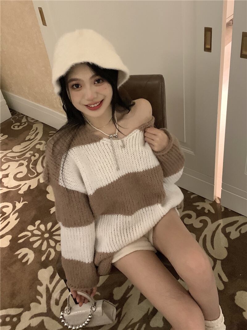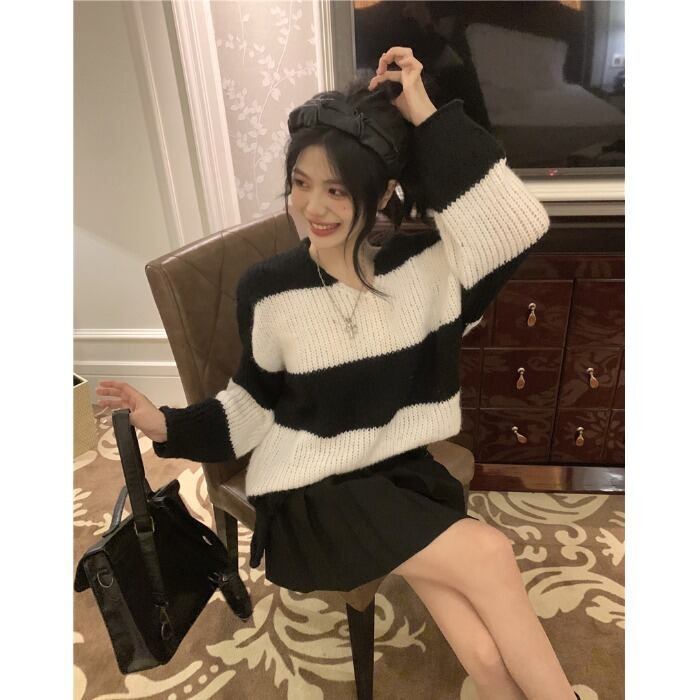 スタンダードカラーストライプセーター オータムルーズニットトップス ロング レトロ 秋物 10/5 秋冬 オータム ウインター ナチュラル mi4642884750986