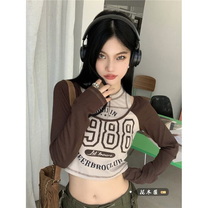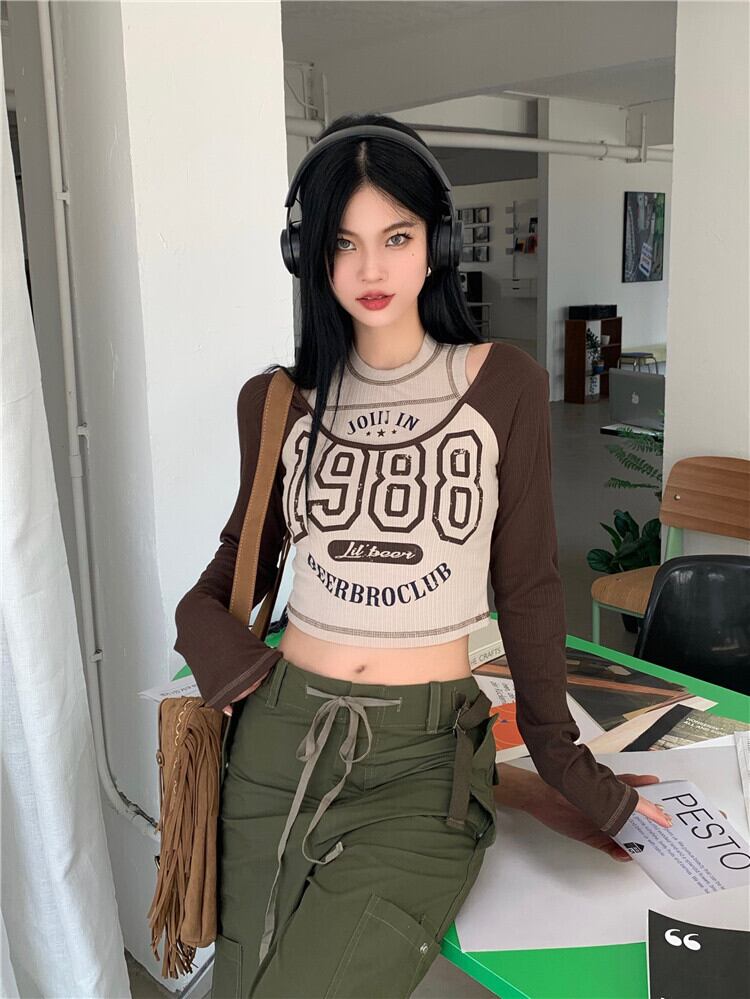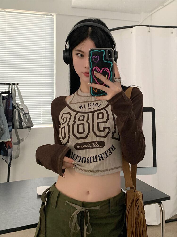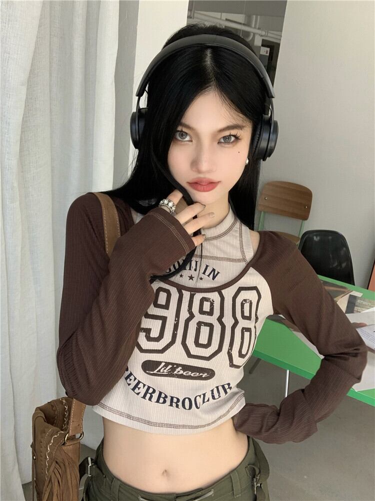 スタンダードプリント柄カラー長袖スリーブTシャツ オータムトップス ロング レトロ 秋物 10/5 秋冬 オータム ウインター ナチュラル mi4670833345081