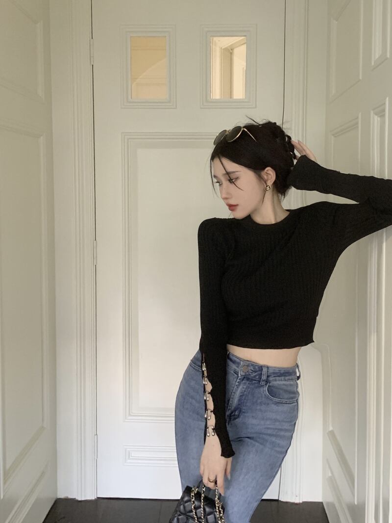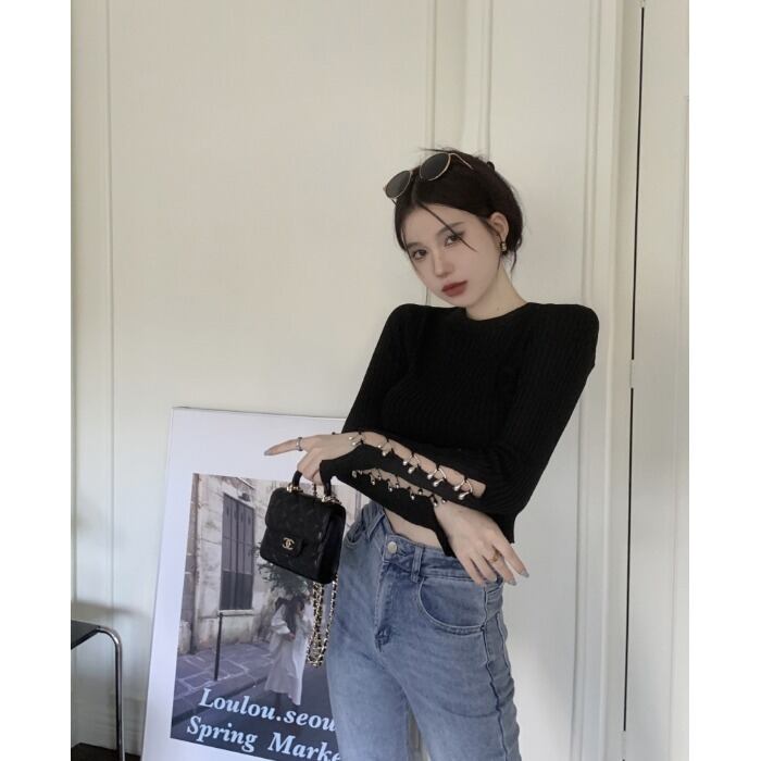 スリムフィットブラックニットセーター オータム薄手メタルボタン長袖スリーブショートトップス ロング 秋物 10/5 秋冬 オータム ウインター ナチュラル mi4634920477045