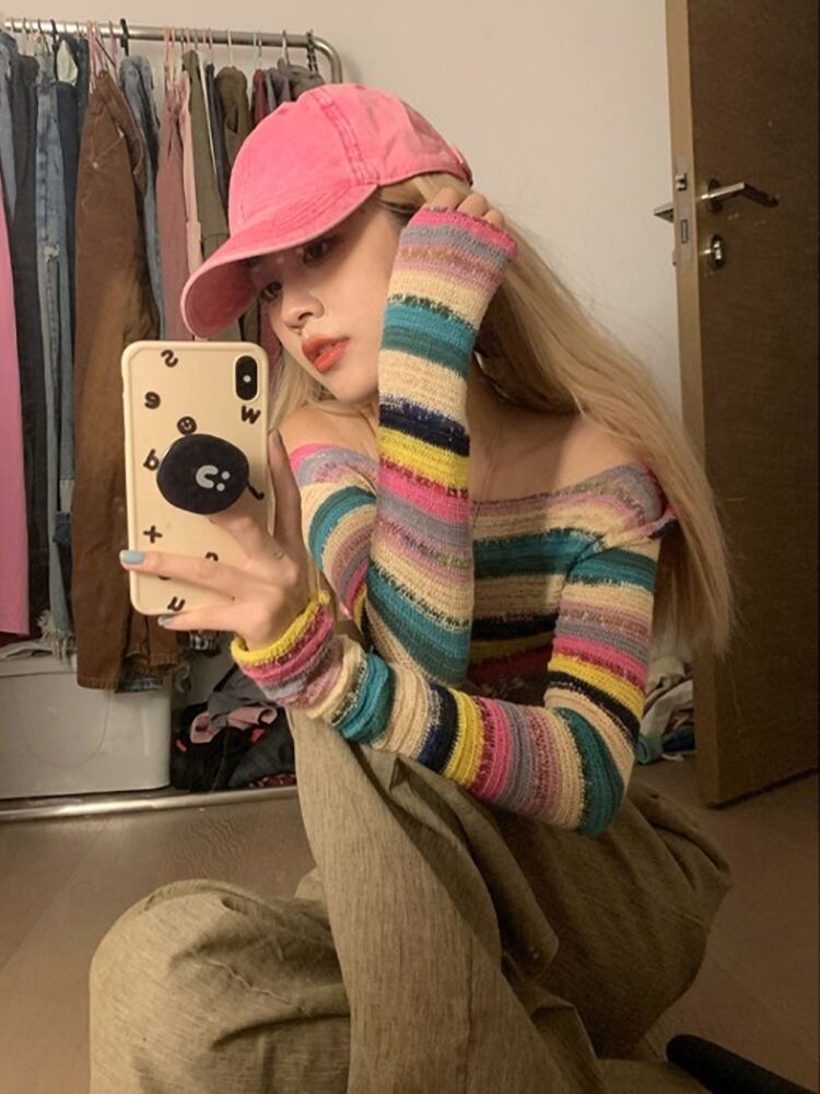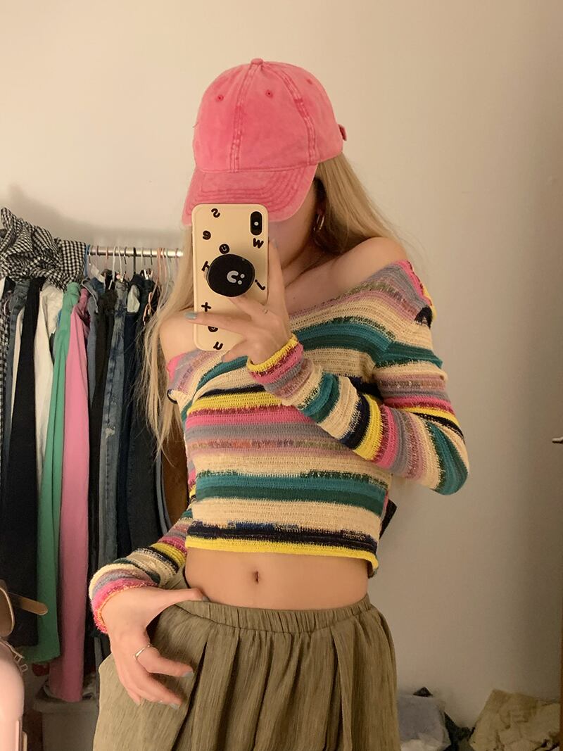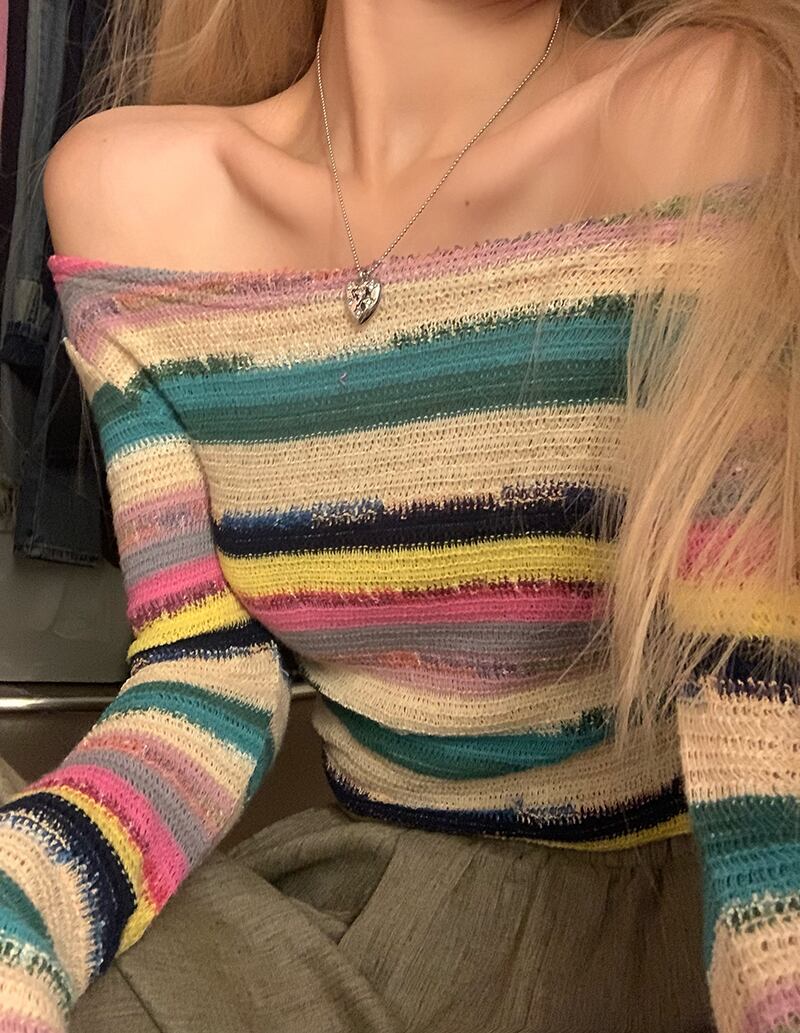 ストライプTシャツ オータムスリムショートニットトップス ロング 大人ガーリー スウィート キュート カジュアル 秋物 10/5 秋冬 オータム ウインター ナチュラル mi4621489100334