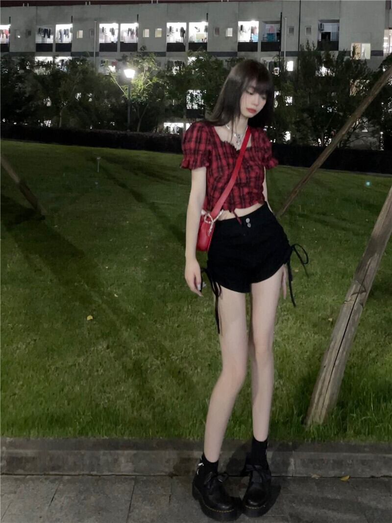 レッド格子柄スリーブギャザーウェストシャツ サマースリムショート 夏物 10/5 秋冬 オータム ウインター ナチュラル mi4670998177217