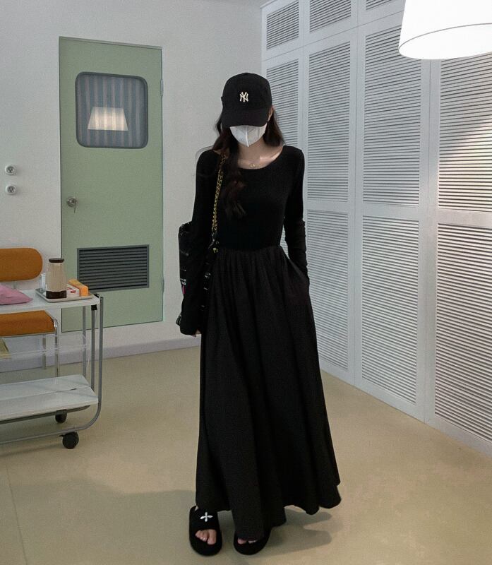 スタンダードブラックドレス オータムウェストスリムスタイルスカート レトロ 秋物 10/5 秋冬 オータム ウインター ナチュラル mi4636216836781