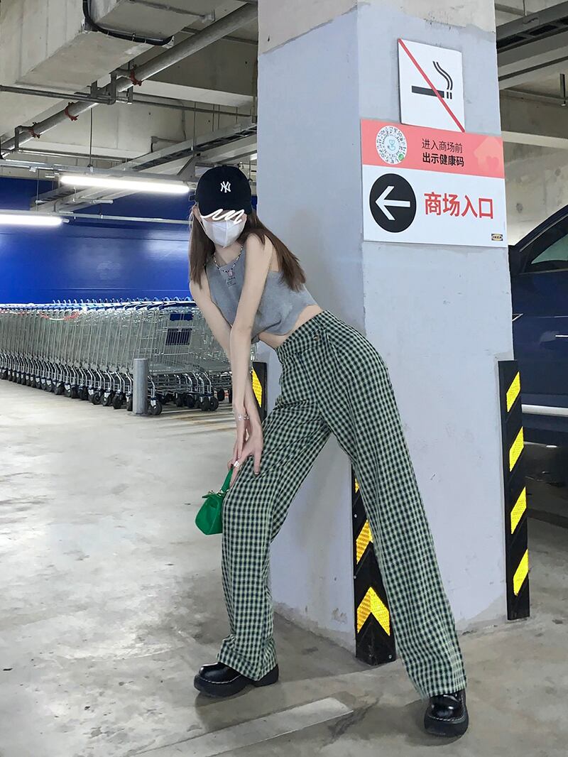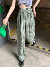 グリーン格子柄パンツ オータムハイウェストウェストスリムカジュアルワイドレッグスタンダードルーズ レトロ 秋物 ワイドパンツ 10/5 秋冬 オータム ウインター ナチュラル mi4634246231424